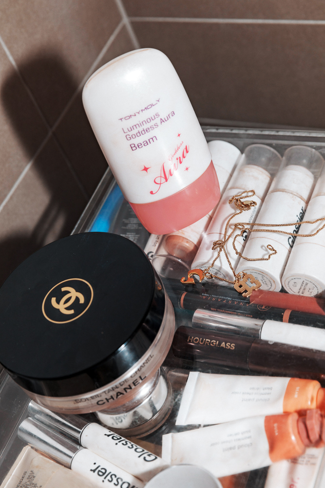 Then I use a light moisturizer—either regular Priming Moisturizer or Tatcha Water Gel Moisturizer—with Clarins Golden Glow Booster to make me look tan. I found the Tatcha gel through one of the Glossier community members and I really love it. And with the drops—I go a little overboard with that...you’re supposed to use two drops, but I use at least four. It makes my skin smell like yogurt, which is kind of weird, but I like the effect. Then I use Invisible Shield on top. My other things are a vitamin C serum and Kiehl’s Creamy Eye Treatment… I just use those when I’m feeling dull or something.