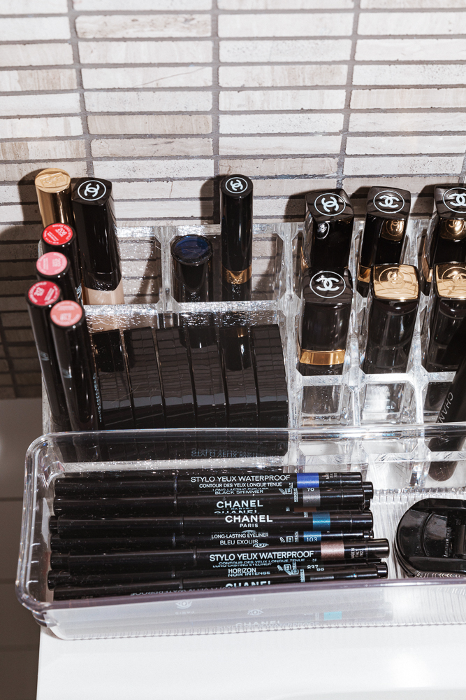 I’ve gotten some makeup advice from some great makeup artists over the years, and my eyes are my best feature, so I want to define them and bring them out more. To do that, I’ll do a liner on the lid margin. Then I usually use a neutral eyeshadow from the Les Beiges Healthy Glow Eyeshadow Palette in the brown/gray/taupe family, and I put on a little blush—Chanel Les Beiges Blush in No. 23. That one is rosy, not peachy—I don’t think I look good in peachy. I use a brush from Chanel…I’m so lucky! [Laughs] As long as you wash and take care of your brushes, you can keep them forever. I don’t know how to contour, but I wish I did. I’ll finish with Rouge Coco Stylo in 218. I have it in my desk at work and I have it here at home. I feel like it enhances my natural lip. It’s a little bit darker, and it’s appropriate for work. And I use Vaseline to moisturize my lips. People always say, ‘You can’t use that!’ And I’m like, ‘I’m putting it on my lips, I’m not eating it!’ And as a rule, I don't use lip plumping products. If something is plumping your lips, it's just because it's irritating your skin.