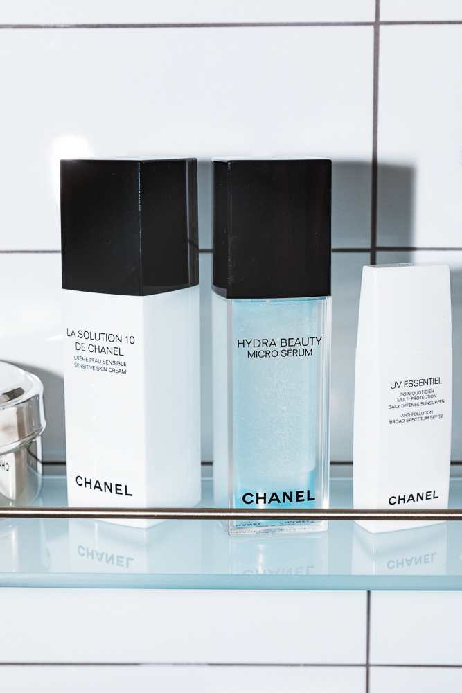 My skin is easily irritated. It can’t tolerate a lot of harsh products or a lot of manipulation. Often it gets rashy or itchy from things like fragrances, and it has to be treated super gently. I can’t just go to a random hotel and use the products—I will get a rash. I have to use fragrance-free laundry detergent. And I have to moisturize every day, twice a day. Dove Sensitive Skin Soap or Purpose Cleansing Bar are my soaps and cleansers. I've used them in high school—a long time ago—and I just now went back to them. If something works for you, no need to change it. My everyday moisturizer is Solution 10 from Chanel, which is a sensitive skin moisturizer. It’s only got 10 ingredients and is fragrance-free, with some Silver Needle Tea extract in it. I’m really into tea, and Silver Needle has got the highest concentration of active antioxidants. This is the first product I’ve worked on from scratch. Chanel has these awesome, state-of-the-art labs in France that I go to every year. For a science geek like me, I can do a lot of really good research there.