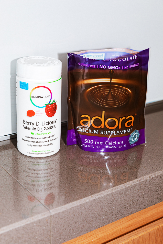 I take Vitamin D3—I eat dairy products but I take D3 because I think it’s important and to offset the sunscreen I wear every day. I also take calcium. Women really need 1000 miligrams of calcium per day and it’s hard to ingest all of that. I want to have strong bones my whole life! I take calcium in a chewable form called Adora, the dark chocolate one. I’m lactose-intolerant and there’s no lactose in that.