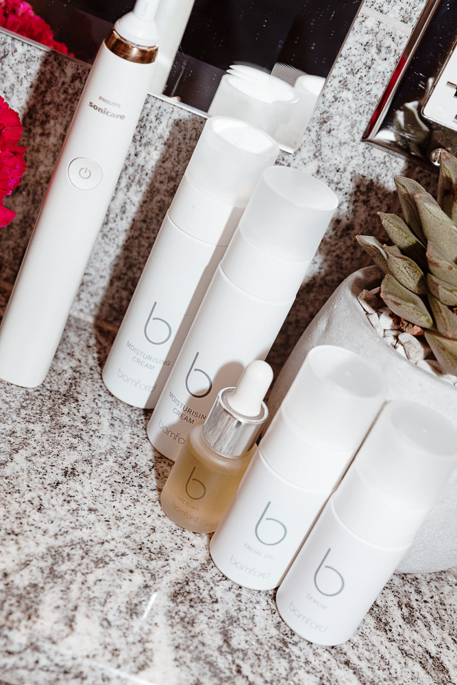 In the morning, I just shower and wash my face with water. And then I moisturize a lot. When I apply anything, I make sure to massage my face to get the blood moving. Bamford is what I use for the basics—I do the serum, then oil, then cream. In the morning, it helps seal everything in and calm everything down. They also make a cleansing and clearing mask that I like to use when I take an Epsom salt bath. Sisley also makes some creams that are really hydrating—their Black Rose Cream in particular. At night when I'm really tired I do make an exception to not take off my makeup. I'll just do it in the morning. Being a mom didn’t change my approach to beauty, the only thing it made me do was do it faster. [Laughs] There’s not time to do anything when you're taking care of your kids."