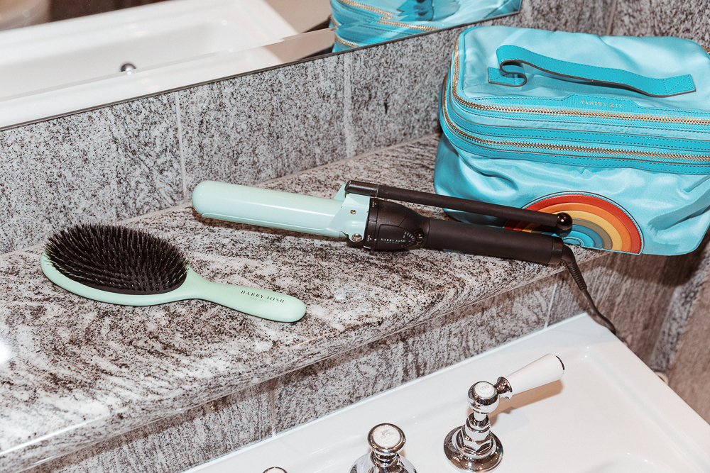 I do my hair with tongs. My favorite way to have my hair styled is with a soft wave, but if I do it myself, it’s straight. I just use a literal hairbrush and a blowdryer to go in and smooth it all out. I do like the brushes that have soft bristles that go in between. Mason Pearson brushes are too soft and wouldn’t get all my knots out—I need one that’s slightly harder. Harry Josh has a great line of hairdryers that I love. They also work really well.