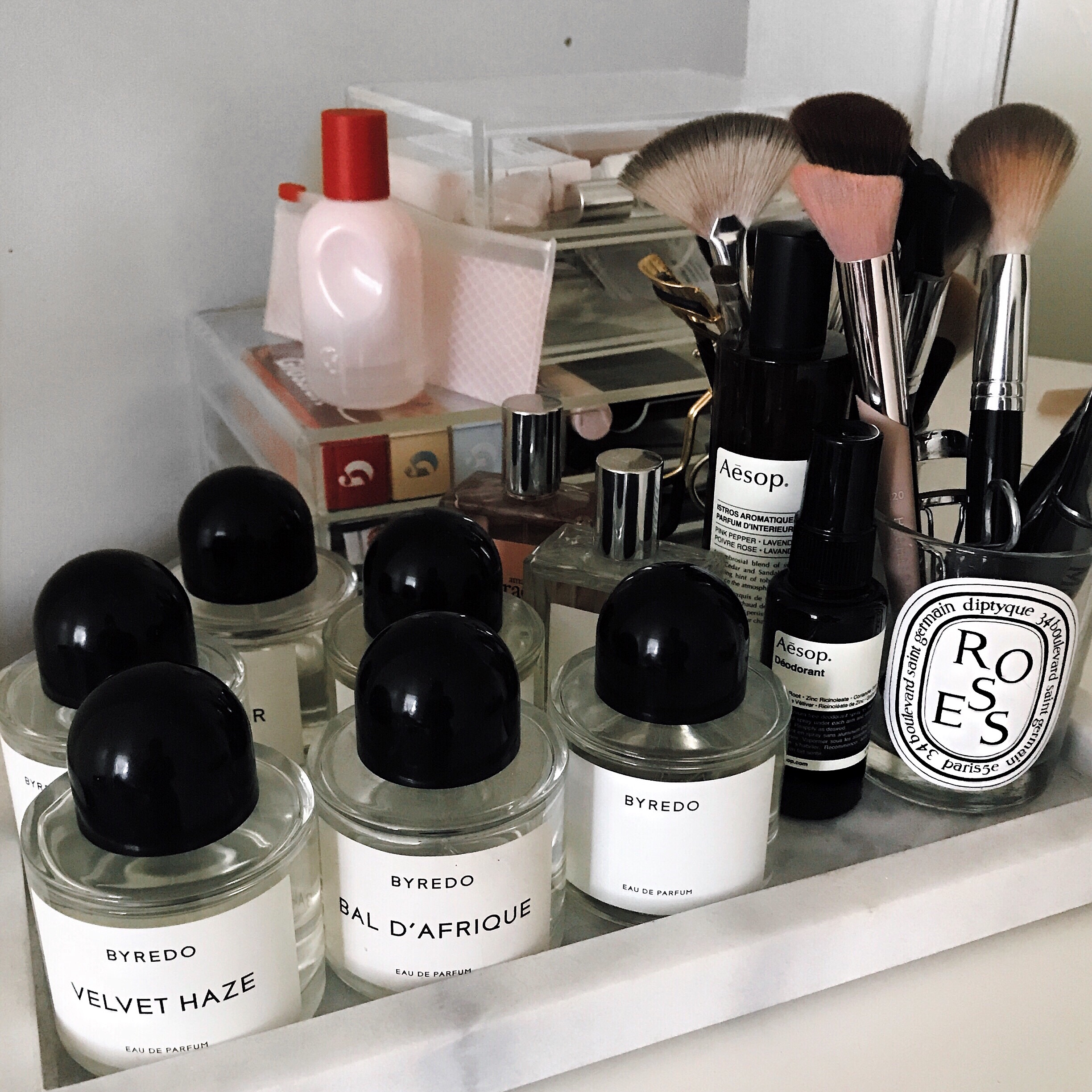 Showering is probably my favorite part of my day. Everyone who knows me knows I love Aesop body products. Their scents are sophisticated and therapeutic. My two favorites are Geranium Leaf Body Wash and, recently, Coriander Seed Body Wash. It has this peppery-fresh scent. I wear a ton of Byredo—my favorites are Rose Noir and Gypsy Water. And I've been wearing Glossier You every day since I got it. It has this hint of masculinity that makes me tingle. It's so perfect.