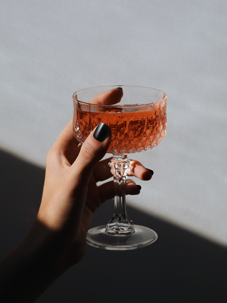 This glass I found at a flea market for less than a $1 and since then it's my cheer-up go-to. Very festive and I love drinking Rosé from it for no reason. Black nails is a reminder that even bad days deserve a celebration! I am wearing Context in Fade to Black and matte top coat by Jin Soon. Rosé by Angels & Cowboys.