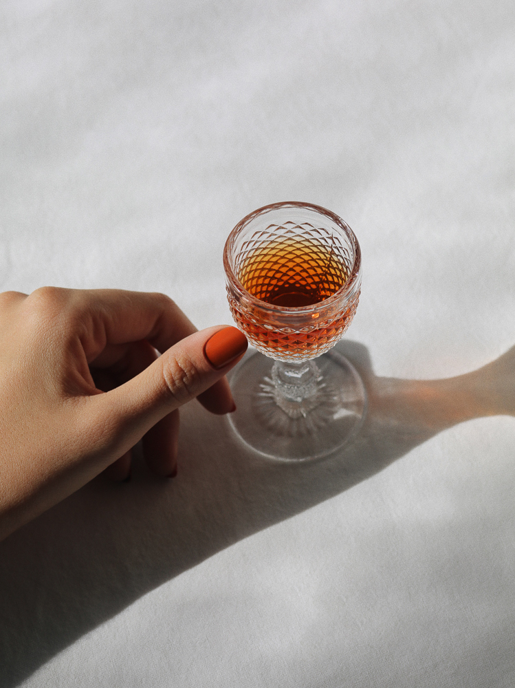 I believe that a small amount of a strong spirit only does a mind and body good, so sometimes I sip whiskey. Whiskey is a serious drink and I suggest you come prepared and match your nails. I am drinking Bulleit and wearing Smith & Cult in Tang Bang. I am the biggest fan of this nail polish brand—I rarely say it but go get some Smith & Cult if you've never tried it.