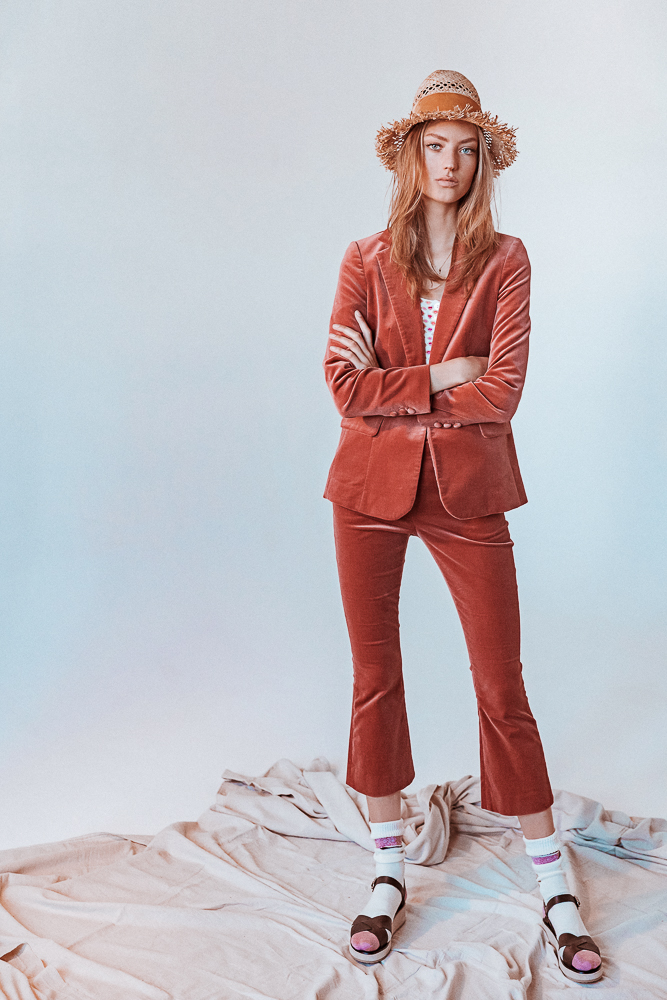 Hat by Trademark. Blazer by Frame Denim. Bra by Maryam Nassir Zadeh. Hoops by Jennifer Fisher. Socks by Coach, sandals by A.P.C.