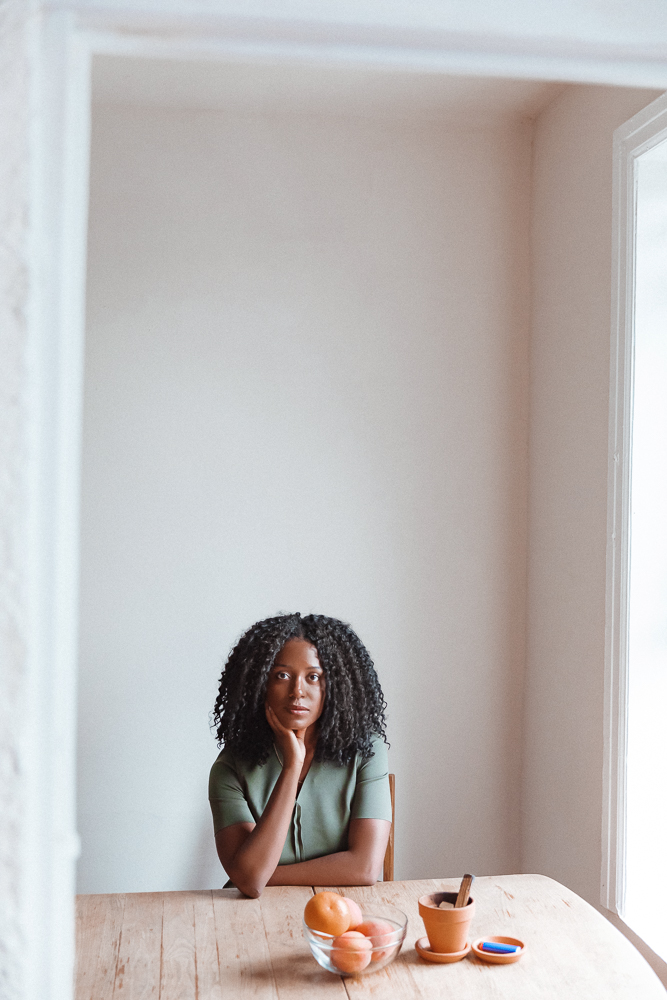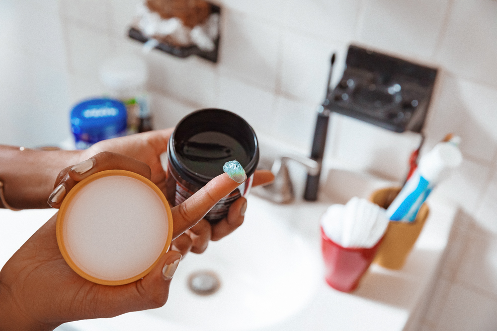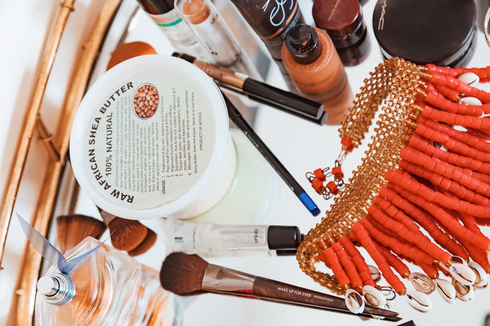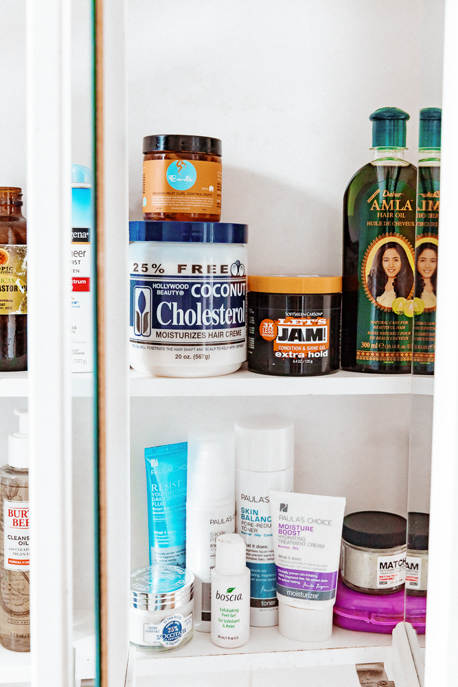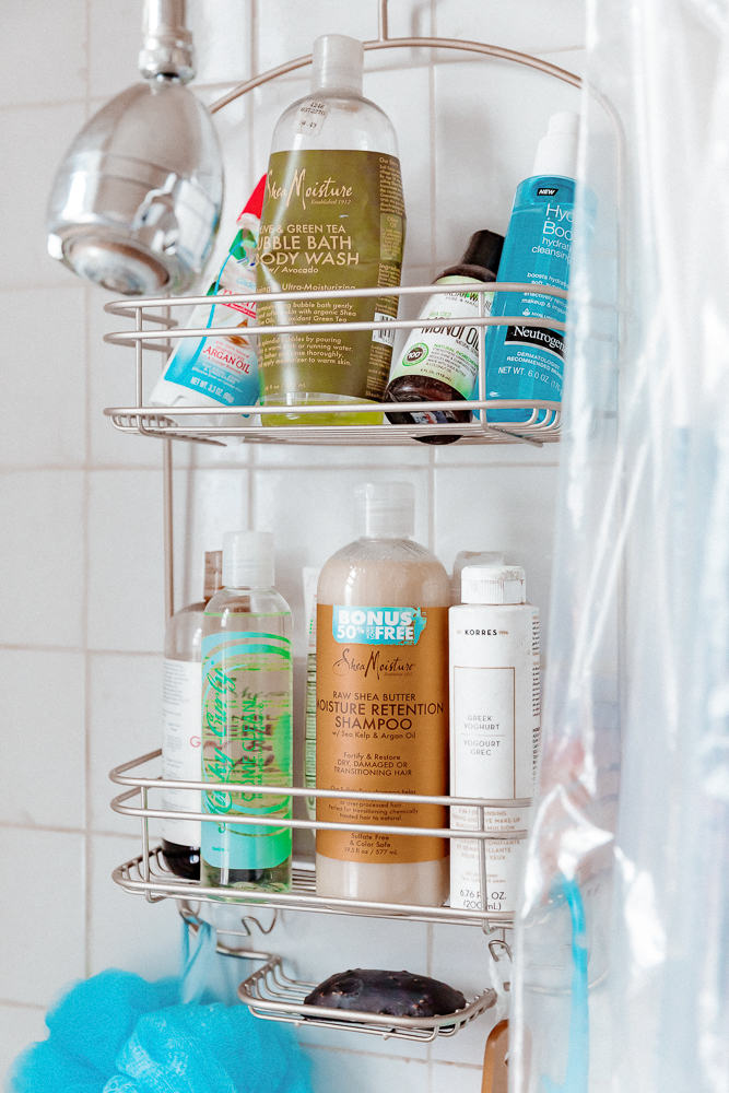 When I come back, I take a shower. I usually use black soap that I buy from any of the aunties on Flatbush Avenue. I would never use it on my face because it’s too harsh, but I’ve seen the dark spots on my body go away from using it. When I’m out of the shower I’ll just keep all the moisture on my skin, and rub avocado oil everywhere. I have coconut oil, but it doesn’t do as much for me. I also use Trader Joe’s Coconut Body Butter—it’s so good. And you know, shea butter everywhere, just in case.