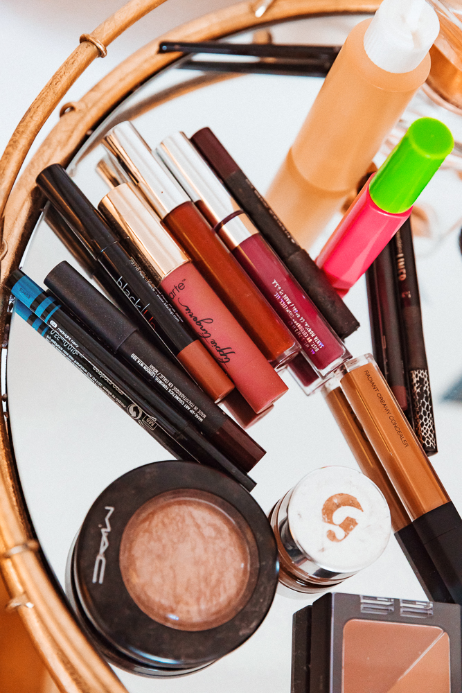 My natural look needs concealer. I love the Nars Creamy Radiant Concealer in Amande. I’ll put that under my eyes and I bake it with Ben Nye in Topaz. I’m too dark for banana powder, but it’s still Ben Nye. I use this Black Opal Foundation Stick in Suede Mocha to contour a little bit. I highlight with the Glossier Haloscope in Topaz.