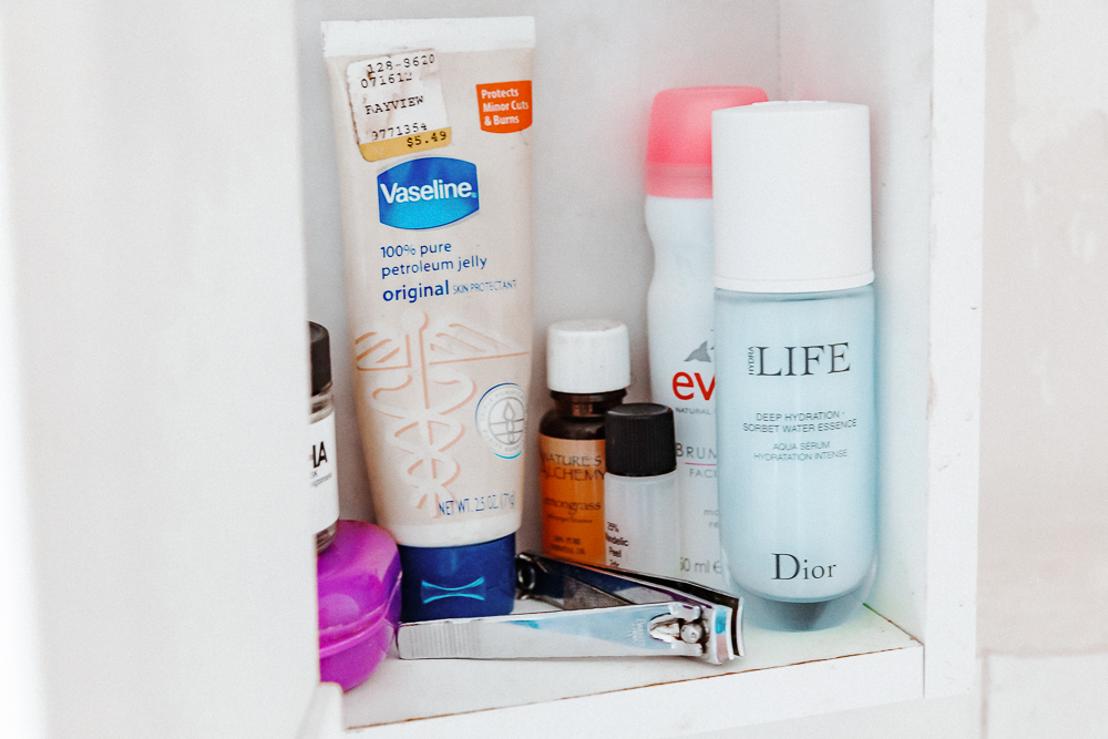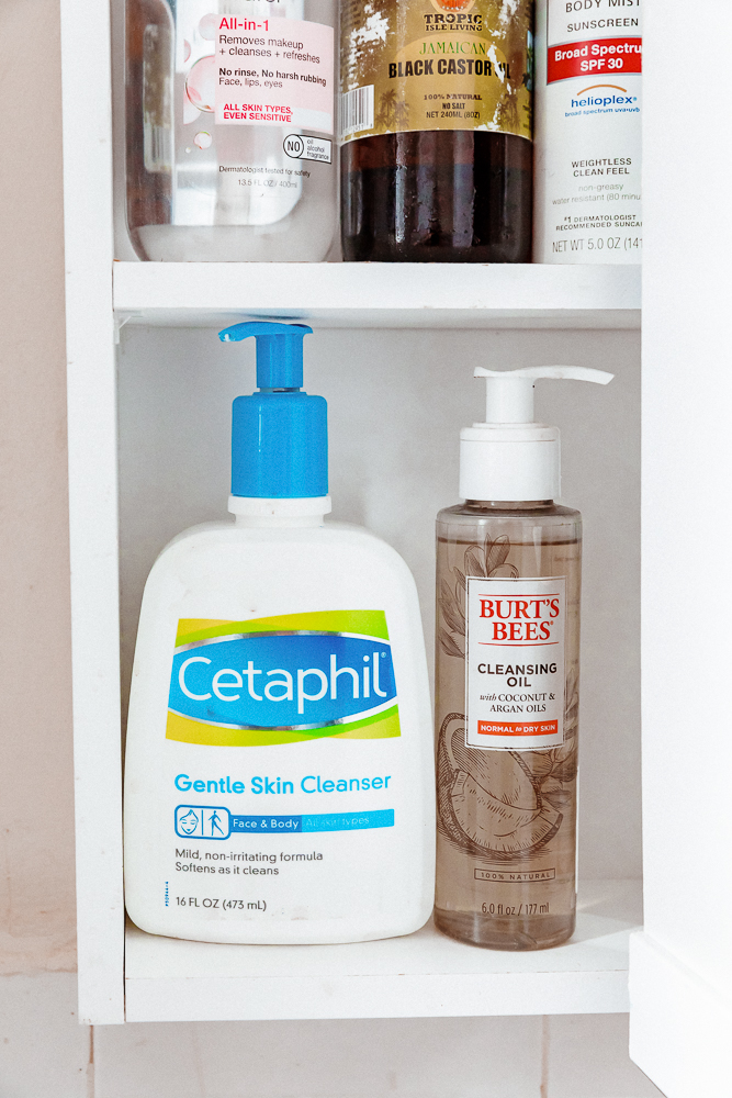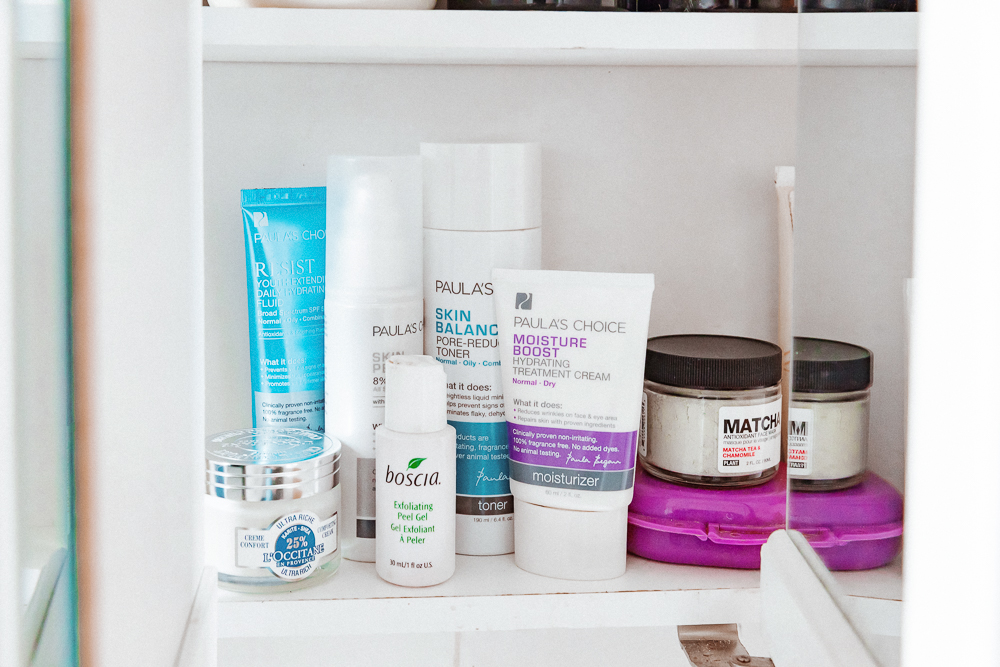 A couple times of week, I do an oil cleanse. That’s when I mix together castor oil, olive oil, and avocado oil, and I get a washcloth really steaming hot and put it on my face for like 30 seconds. It’s supposed to dry out the impurities, it really works. Your pores just get cleaned out. I repeat it two or three times depending on how my skin feels. If I’m breaking out I’ll put in a bit of tea tree oil. I love oil. I use Neutrogena Hydro Boost to cleanse my face otherwise. It just works! Before that, I was using Korres Oatmeal Soap for a while, but I feel like it left a little bit of a film on my skin, so I’d have to tone after using it. I tone either with witch hazel or with Paula’s Choice Skin Balancing Pore Reducing Toner.
