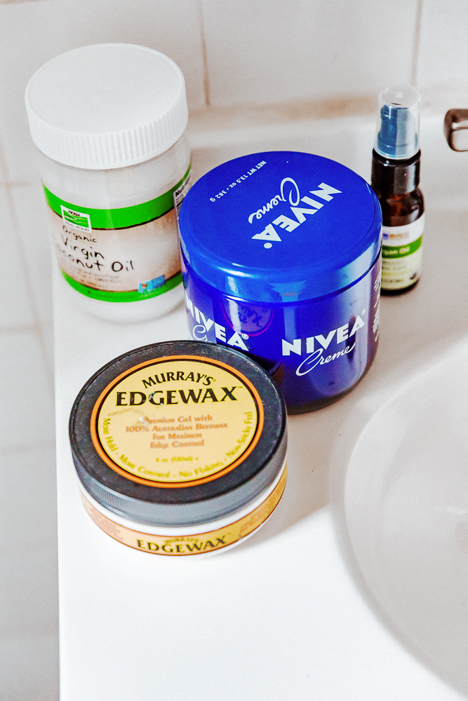 Before I do my leave-in, I do use this Coconut Cholesterol Deep Conditioner. This is really some OG, Flatbush shit. I think it literally does have cholesterol in it. Another thing I use is Oyin Handmade Juices & Berries. It’s kind of like a liquid styler, conditioner thing. It just really hydrates my hair. For my edges, I like gel. I use the Curls Passion Fruit Control Paste. But if it’s humid, I’ll use beeswax. It’s not the best thing to put on your hair, but mine is pretty resilient.