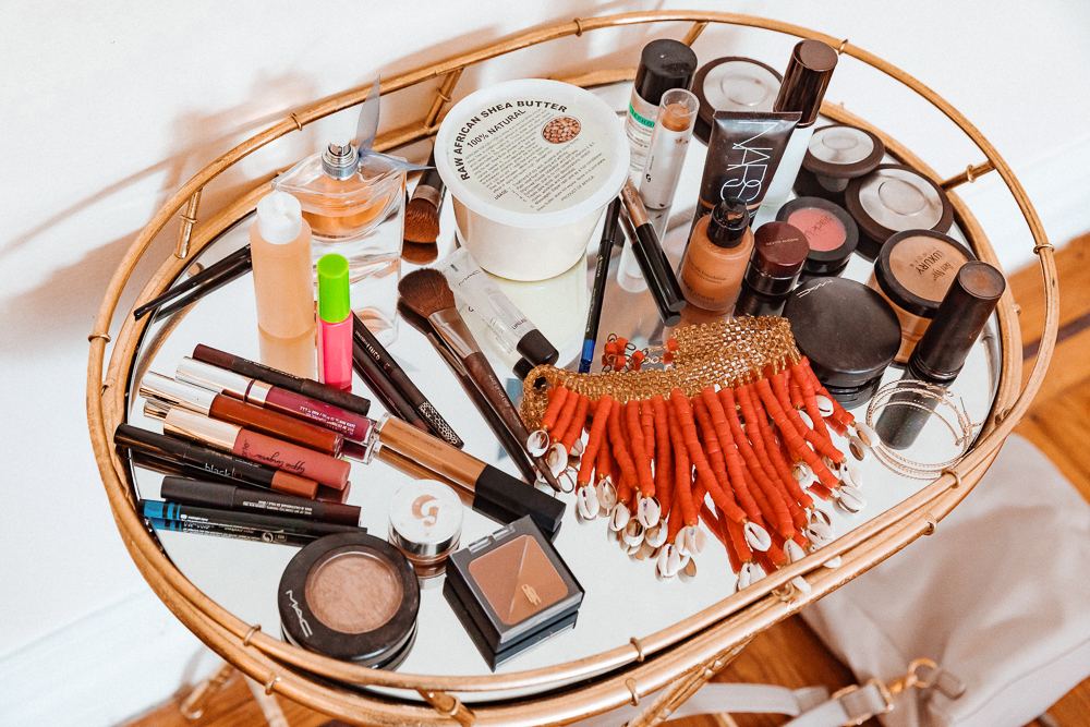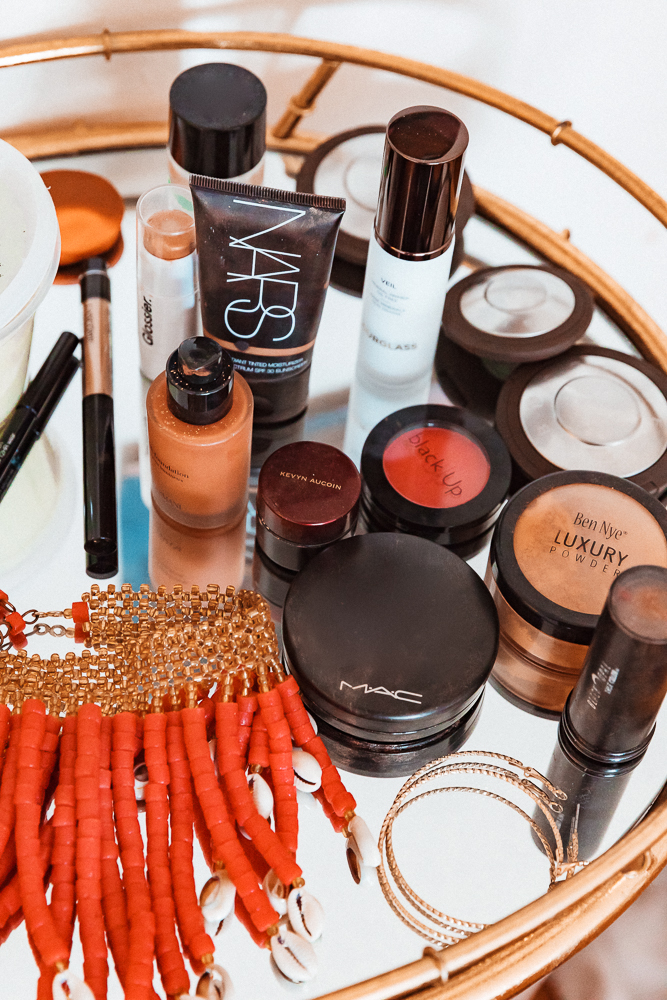 Sometimes I’ll wear Nars Pure Radiant Tinted Moisturizer in Dark 1. If I don’t wear that, I’ll wear the Kevyn Aucoin Skin Enhancer. It’s a little dark for me, so I mix it with some Cetaphil moisturizer. For special occasions, I use Armani Luminous Silk Foundation in 11.5 for more coverage. Then I use the Becca Shimmering Skin Perfector in Topaz—everything is Topaz. Some days I kind of cheat like it’s not a makeup day, and I’ll use the MAC Skinfinish and leave. That’s where I say I’m not wearing anything. I’m all about that lie.