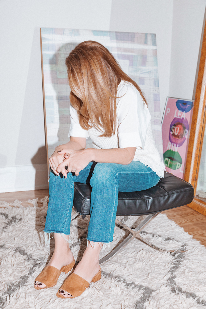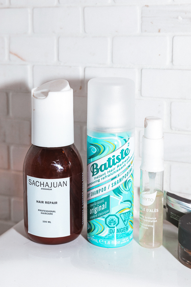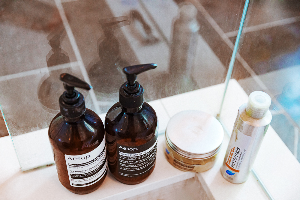 For my hair, I try waiting about five days before washing it. The more you wash your hair, especially with things that foam, the more you trigger oil production. So it’s actually healthier–way, way healthier–to stretch out the time between washes. My products are Aesop and Phyto. The Phyto Intense Hydration Oil Treatment is a win-win—it’s got this churchy aromatherapy smell, and it’s good for my hair! To style, I’m being totally honest and transparent here, but I will generally go to bed with wet hair, and then I’ll curl it out in the morning, because it’s the least amount of time, and it’s the easiest, and it’s a routine that I can get into and not put a lot of time into it. I also use the Batiste Dry Shampoo and the Sachajuan Hair Repair. I use it as a styling tool after my hair’s done, never as a conditioner. I like the way it smells, too. A happy, free smell.