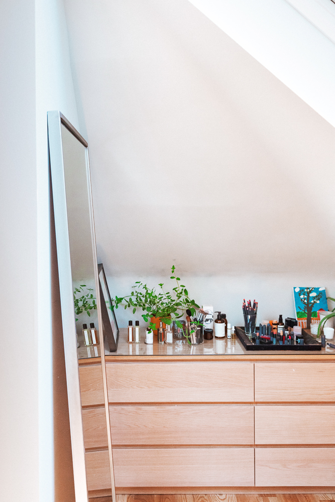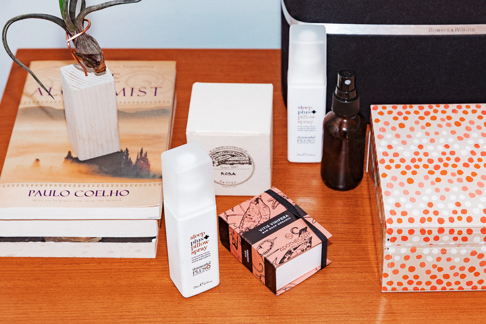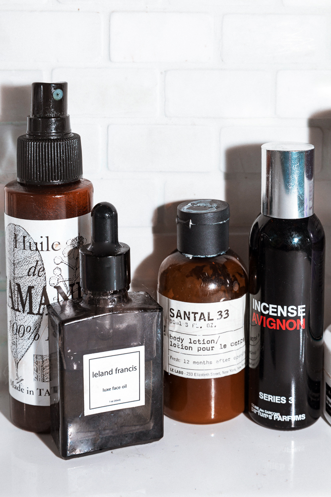 There are other beauty products that I love–it’s endless. I love the Garnier Ombrelle Sport–it’s my guilty pleasure. I love Grown Alchemist and NIOD. I mean, I have a jar of sesame oil here—I like the really basic stuff. I love RMS and I always have a backup of this Deep Sleep Pillow Spray from This Works, because it works. I’ve got one on the side of my bed, I’ve got one in New York, one on the farm… It’s lavender-y, but it has that woodsy smell. So I have boxes of products in my closets, because I try everything. I want to know how things feel when I use them, and what’s in them—but my everyday routine’s very simple. It’s just based on a couple of principles like protecting and cleaning the skin, and nourishing it–well, not the pillow spray.”
