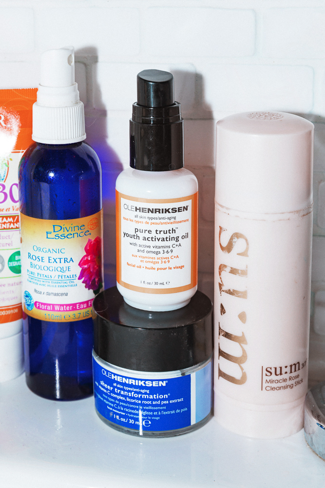 My beauty routine is primarily all-natural. I try, but it can be tricky. I love the SU:M37 Miracle Rose Cleansing Stick because I can travel with it. It’s got rose petals–I think it’s 100% natural, I looked through the ingredients. I just do that, and a little bit of water, use it literally everywhere and wash it off. It also removes makeup–I’ve been using it for about a year. I also cleanse in the morning because I put a fair amount of oil on at night, so I take that off when I wake up. I’m kind of obsessed with tamanu oil right now–it’s a little heavier, doesn’t smell great. Really the thing I love about it is that the tamanu tree can only live if it has one root in the soil and one in the ocean. I loved the significance of that. And, obviously, it's only on islands as a result. But it’s anti-inflammatory, anti-aging, cell-regenerating, it’s just a really hearty oil. So I’ll use that at night, but during the day I’ll put on the Leland Francis Luxe Face Oil–there’s a lot of tamanu in it. I just like the texture of it, it’s very light and absorbs really easily. With an oil, you need to use a hydrosol. It’s osmosis, it’s how skin works. You kind of suck the oil into your skin by using hydrosol. Right now I’m using the Divine Essence Rose Extra Pure Petals Organic Floral Water–they grow roses organically and create a hydrosol. And it’s also made for food. Then I use the Ole Henriksen Sheer Transformation, because it’s really nice and light. He uses great ingredients. I also use the Truth Serum.