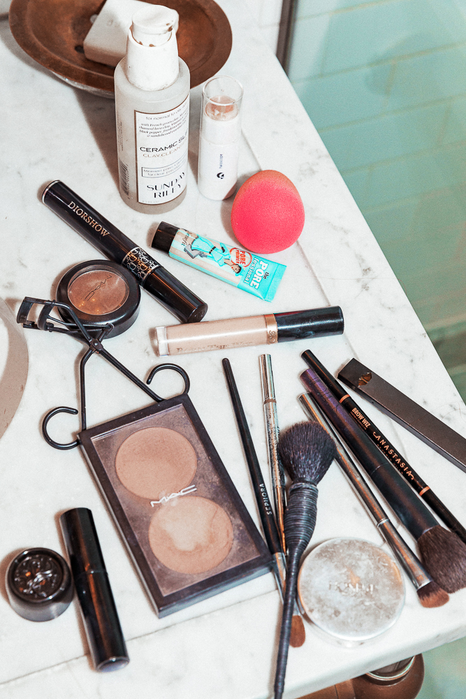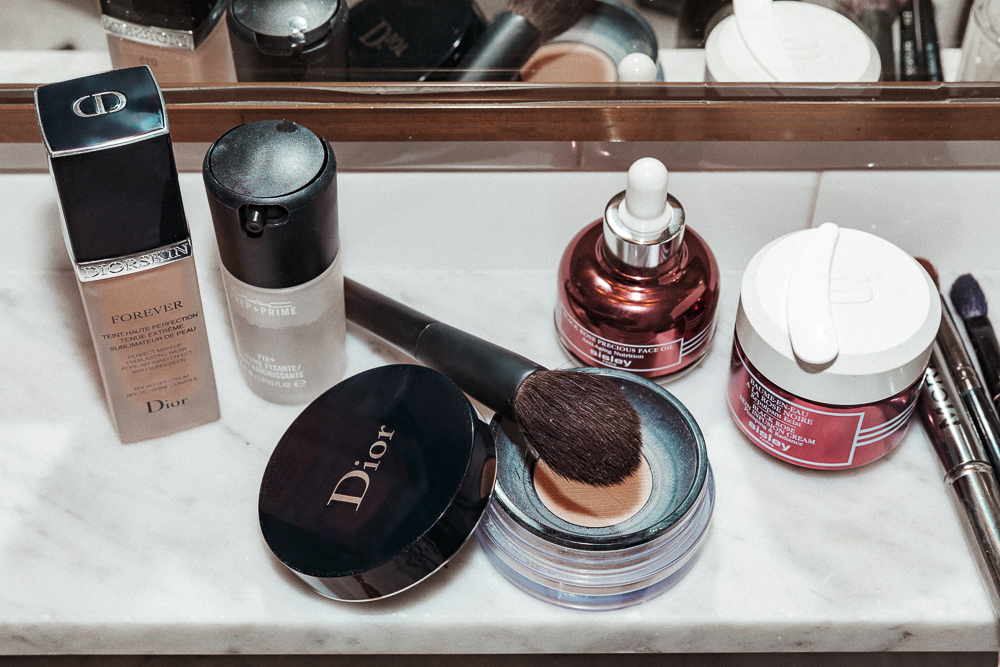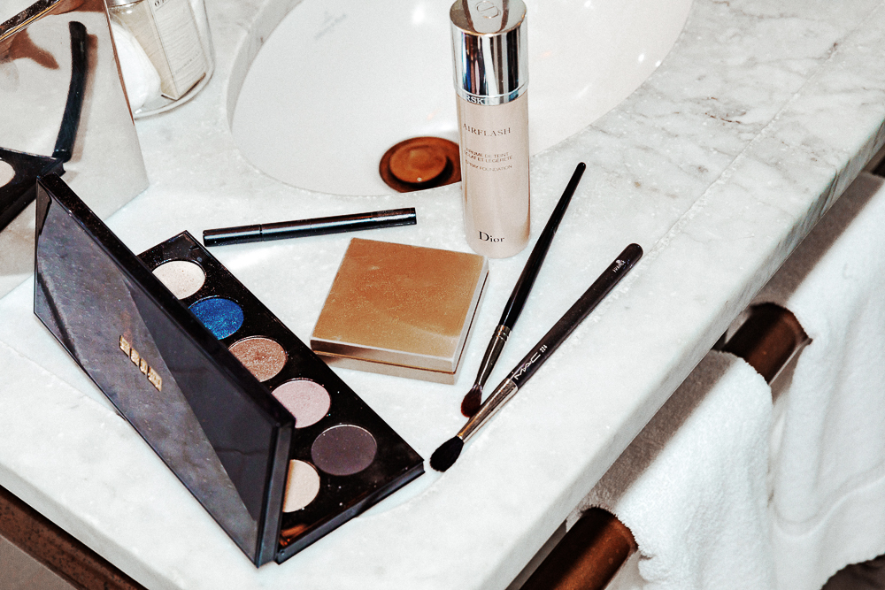 For an event like tonight, I’ll wear Diorskin Forever Foundation. I usually use a high-coverage concealer—my favorite is Clé de Peau, the stick one. For underneath my eyes, I use the Born This Way Too Faced concealer. That one is perfect because it’s brightening and hydrating and looks like skin. I don’t want makeup to look artificial, I want it to look like it’s always been there. Like you just go to bed in your smoky eye, that’s how perfect it is. To finish, I love the Dior Loose Setting Powder. It’s so finely milled and not talc-y, so it makes everything really nice. One trick I have is to put all my creamy products on, then my powder, and then I’ll put more creamy products on top so it doesn’t look one-dimensional. So, I’ll go back in a second time and reapply a little bit of concealer if I have to.