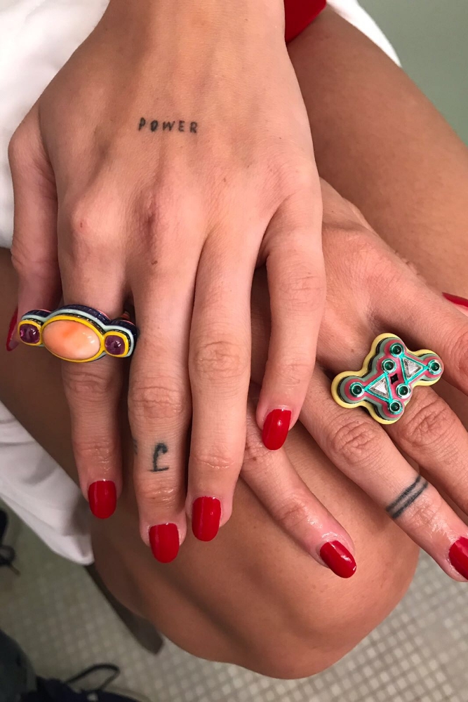 Adwoa left adorned in some amazing jewelry by Solange Azagury-Partridge—two bright pop rings that look like layered, lacquered colors piled on top of each other, almost like rock formations. Oh—and she's wearing a Michael Halpern dress that is brilliantly leggy, so I went to town making her legs super glossy and golden using my favourite Evolve Satin Leg Gloss. It's organic, hand made in the UK and it smells divine.