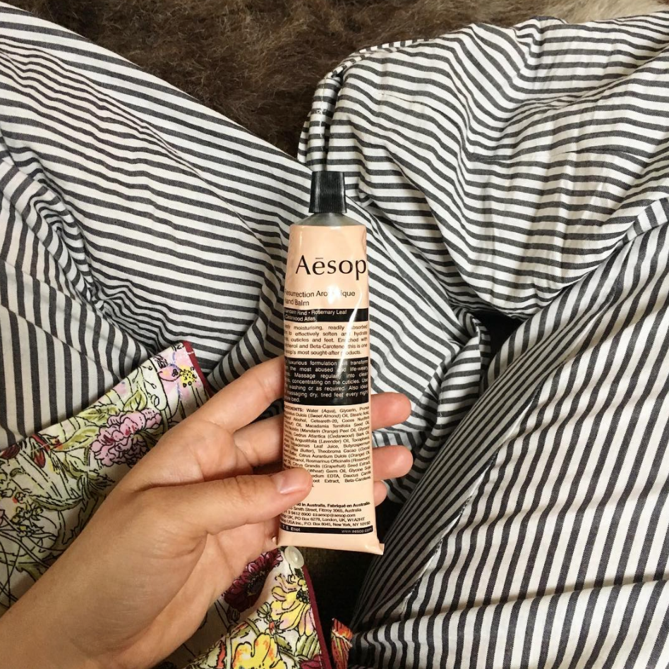 When I am finished applying my makeup I take a tiny dab of face cream—maybe the size of a dime—and warm it up in my hands, then pat it all over my face. It really softens your makeup and adds a dewiness. I hate when I can see caked on powder or makeup, and I think just adding that tiny bit of lotion really lets your makeup seamlessly blend into your skin in a way that’s natural and fresh. I also use Glossier Balm Dotcom as an eye cream in winter. My under eyes get so dry, and putting a few dabs on at nighttime before bed has made a huge difference for me.