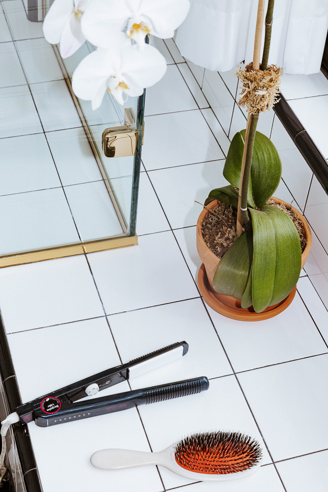 When I’m getting into music, I often have bangs. When I’m back into modeling or my real life—no, I don’t really wear them because they stick to your forehead. I have a very good hairdresser in Paris called Maxine. He’s great. I like my hair to be dark, but my hairdressers have been using products that are much less aggressive and when you wash it, the color washes away. I use an iron to style it before I go onstage to give the hairs a little movement. Just the ends, and not too straight, because my hair is already straight.