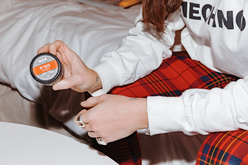 Jackie: Yeah I’ll go and make myself some products… In terms of my skincare routine, I just wash my face with Fran’s F. Miller Cleansing Oil, which I really like. I don’t really like soaps on my face. Before I met Fran, I just didn’t wash my face—I would just wet it and put cream on it…