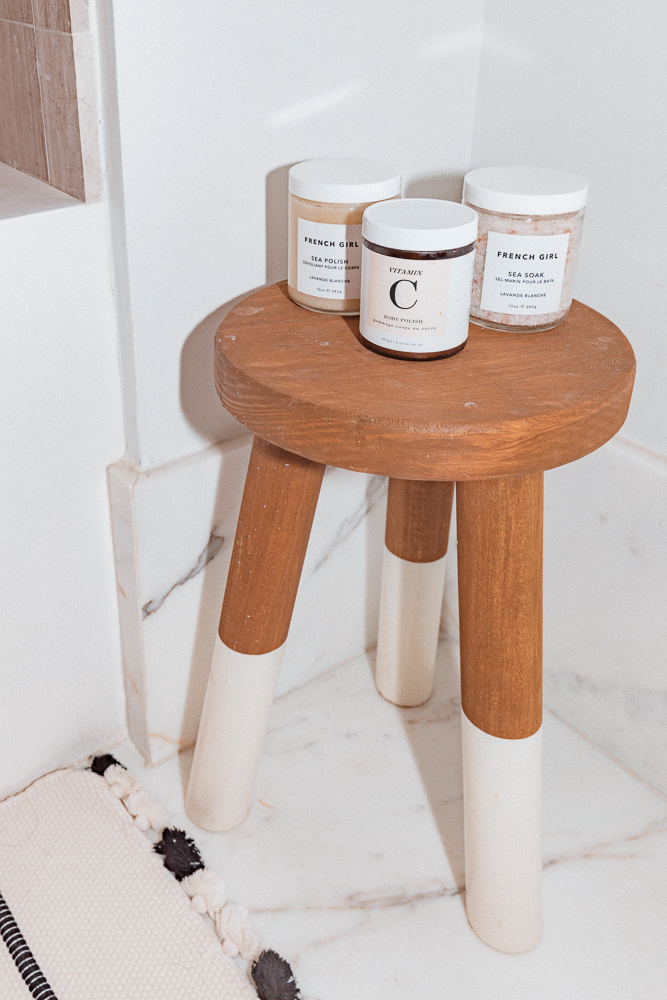 I love a good body brush that I can just put product on and scrub a little. I use a curved bristle brush with the One Love Organics Body Scrub. They also have a really cute heart-shaped sponge for the face- I need to replace it but I love it. After that, I’ll put on a body oil, because I think it’s just so easy, and it smells good too. I’m a sucker for the Aesop Body Balm because of the smell. I also love the Lumiere Leman Body Oil from French Girl Organics. It’s really nice for when you’re more dry or the Daughter of the Land Oil on my face and body.