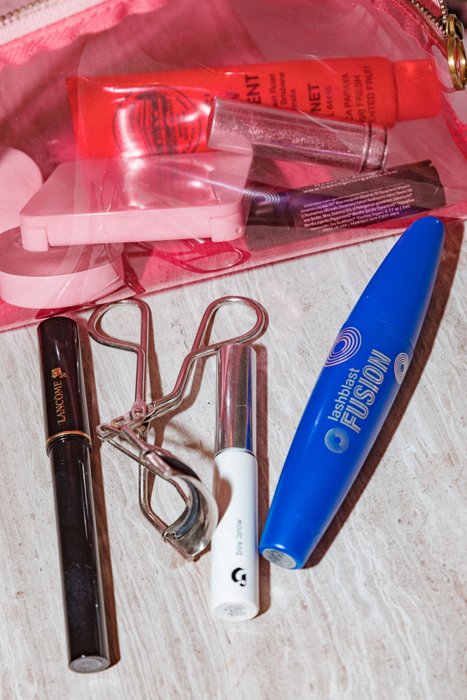 Right now I’m using the Signature Set from RMS which is awesome because it has a luminizer, bronzer, lips to cheek stuff. I usually wear a bit of eyeliner on my top eyelids—I’ve been doing it for years. Lancôme is great, but the other one I used to use is the MAC Liquidlast Liner—it's super permanent and you can barely get it off. My favorite thing in the world is Glossier Boy Brow in Black—it really is perfect. My eyelashes are so straight so I really have to use an eyelash curler—mine is Shu Uemura. I actually really love the CoverGirl Lash Blast Fusion in Very Black. I just do the top lashes because when I do it on the bottom I feel like it just gets all over my face.
