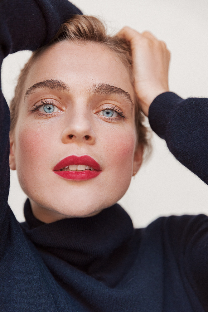 In my day-to-day life I like to be pretty natural. I’ll wear mascara. My dad’s girlfriend gave me the Clinique one that washes off with warm water. It’s perfect because cold water doesn’t do it—if you’re in the rain, it’ll stay. I wear a little bit of concealer if I have a spot somewhere. I have one from Chanel. It doesn’t become patchy or clunky. I like to wear red lipsticks—the ones I have are from MAC, I like their color and that they’re really matte. I don’t use anything in my brows except a clear mascara from The Body Shop.