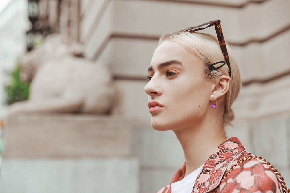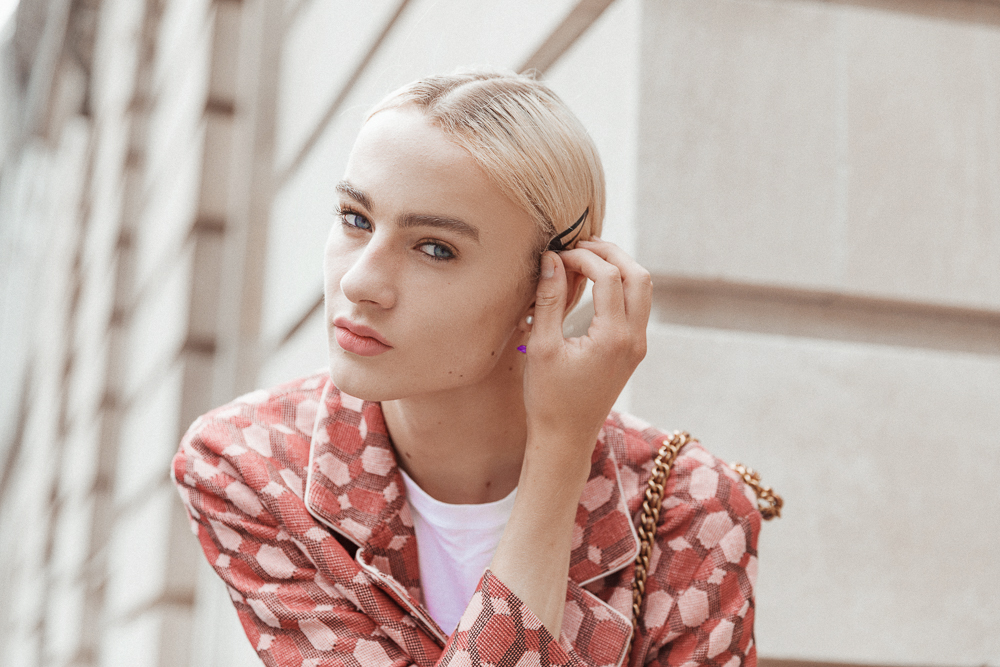 I bleached my hair a long time ago on a vacation when I was 15. I was absolutely bored, so I just decided to do it! It’s very hard to keep it moisturized because it gets so damaged, but I try to use a lot of coconut oil—it’s the only thing that helps. In the beginning, I’d color it myself—now, I usually just get it done backstage, and otherwise I go to Cim Mahoney in Copenhagen. I just cut it again because my hair was breaking off, but I hope I can get it [to grow] longer. I’ll wash it with Less Is More. That, and I use Karmameju. Sometimes I use silver shampoo to keep the blonde right. And to style, I’ll usually put some L’Oréal hair gel in to keep it slicked all the way back.