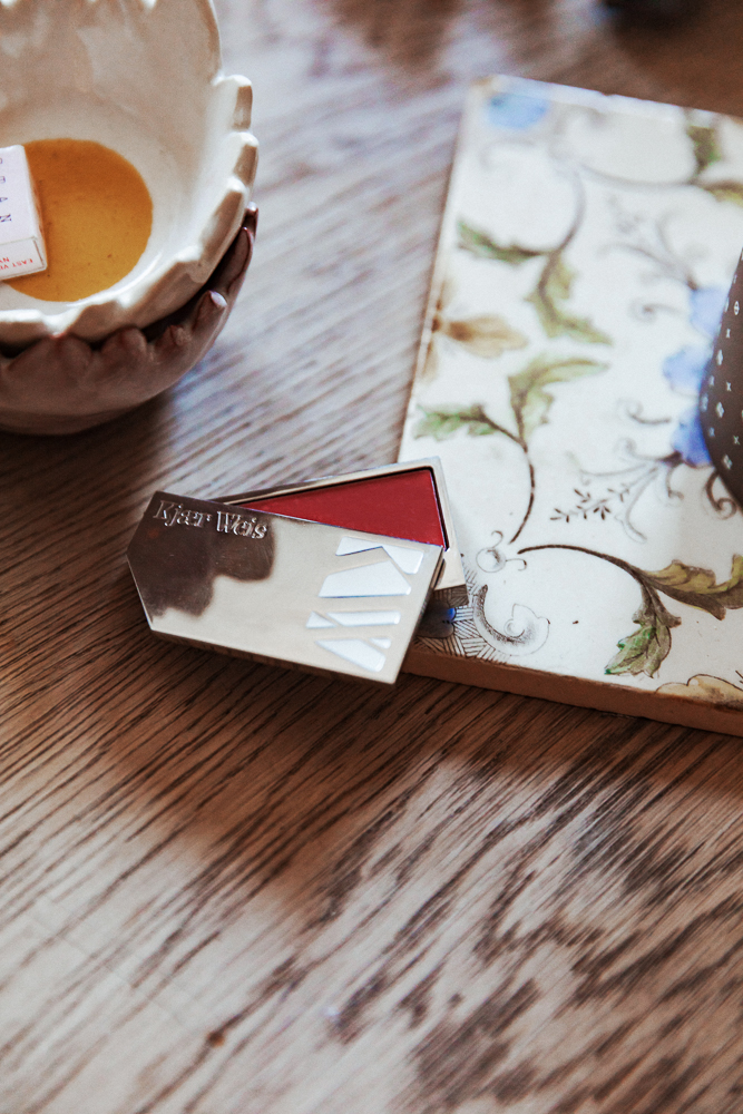 I typically use a little bit of blush, like this one from Kjaer Weis. It’s so precious, you take better care of it. The packaging is beautiful, and then you can just buy the refills. I think that’s how all beauty companies should be because otherwise you throw out so much. But I love blush. Whether it’s a lipstick or an actual blush or a lip tint, you can bring just that and you’re good. If I’m going out, I like to add a little smudgy eyeliner or a red lip. I like the Marc Jacobs Highliners for a smudgy eye, mostly because you don't need to keep sharpening them. I always love when you come home from a party and you start taking your makeup off and it looks great when it’s all mushed around, so I’ll use a brush to smudge it out. Then I’ll use the RMS Eye Polish in anything taupe or golden and that’s it.