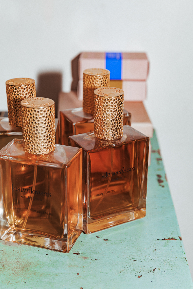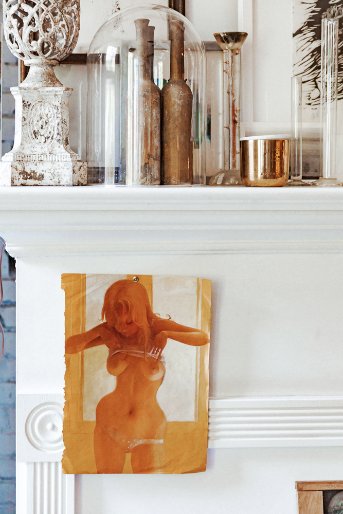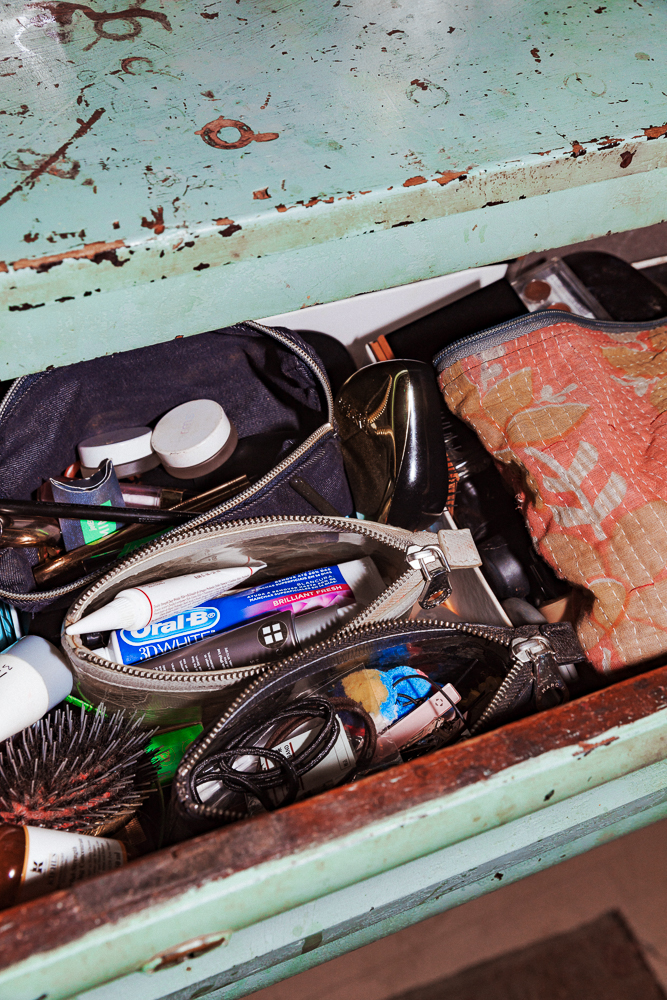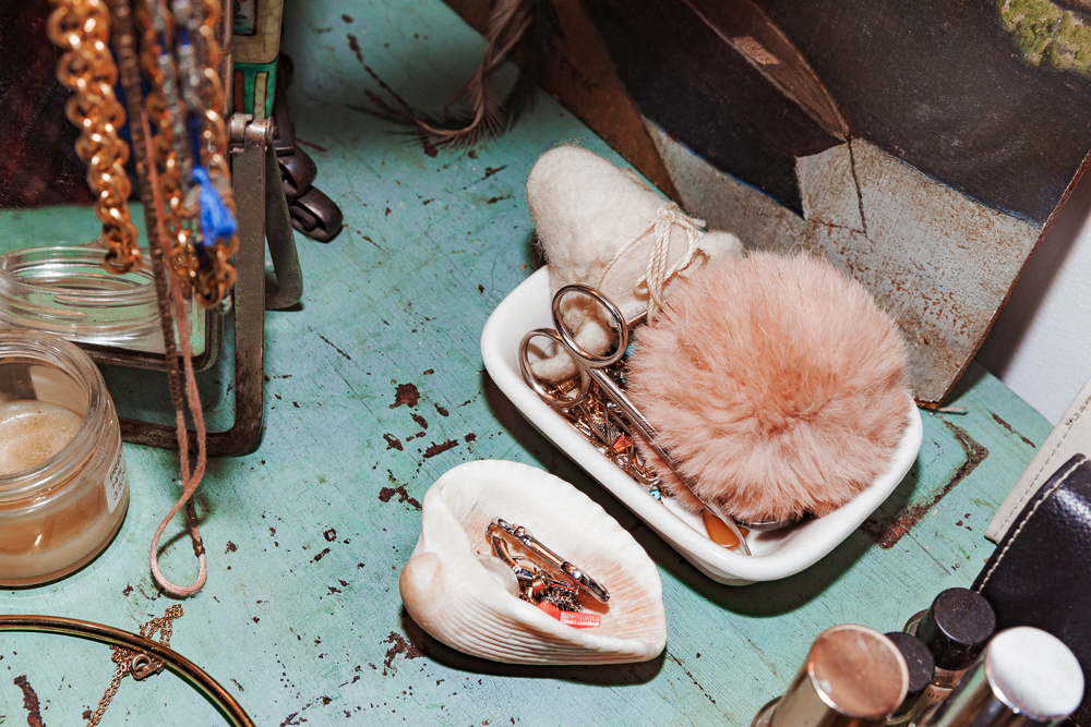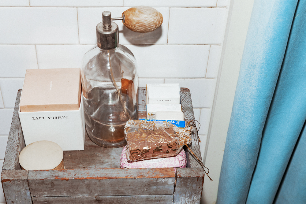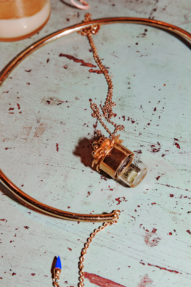 I was going to show you my perfume because my friend and I have this company called Strange Love. Our creative director made these necklaces so that girls could carry their fragrances around their necks. I just love the image of memories and how fragrance triggers that. Since I was in my early teens I was into antique perfume bottles and that’s kind of where this idea came from—having this thing hanging around your neck with a photo of your loved one. We base all our scents on pure oud. It’s absolutely hypnotic, you don’t go anywhere wearing this without people saying something. I love Narciso Rodriguez scents and Cacharel, or Grey Flannel by Geoffrey Bean.