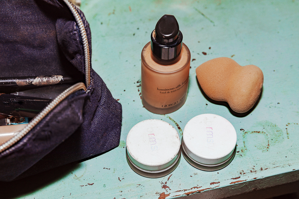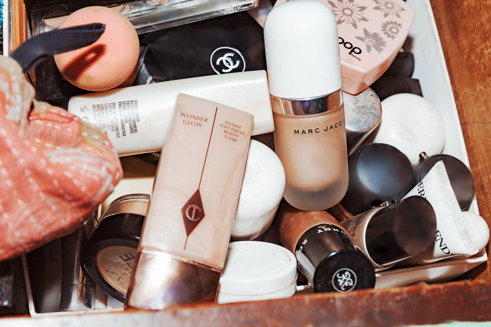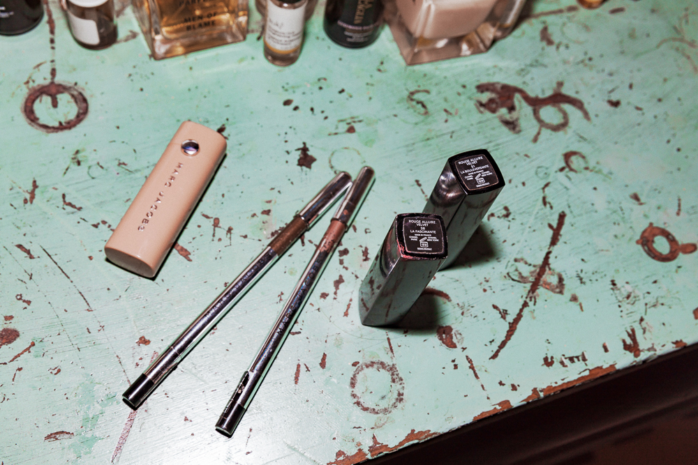 On a daily basis, for makeup, I wear foundation and concealer. I have a really good Armani foundation, and a concealer from Nars that I like—I have quite a bit of Nars. The Giorgio Armani Luminous Silk Foundation I just put on with a Beautyblender. Then I’ll do the Charlotte Tilbury Bronze and Glow or the Marc Jacobs Glow Stick to highlight my collarbones, legs, shoulder, and arms. Again, I have to have lipstick. I love Chanel lipsticks. Especially the push pen in Les Fascinantes, or Marc Jacobs in Understudy—it’s the only light lipstick I like.