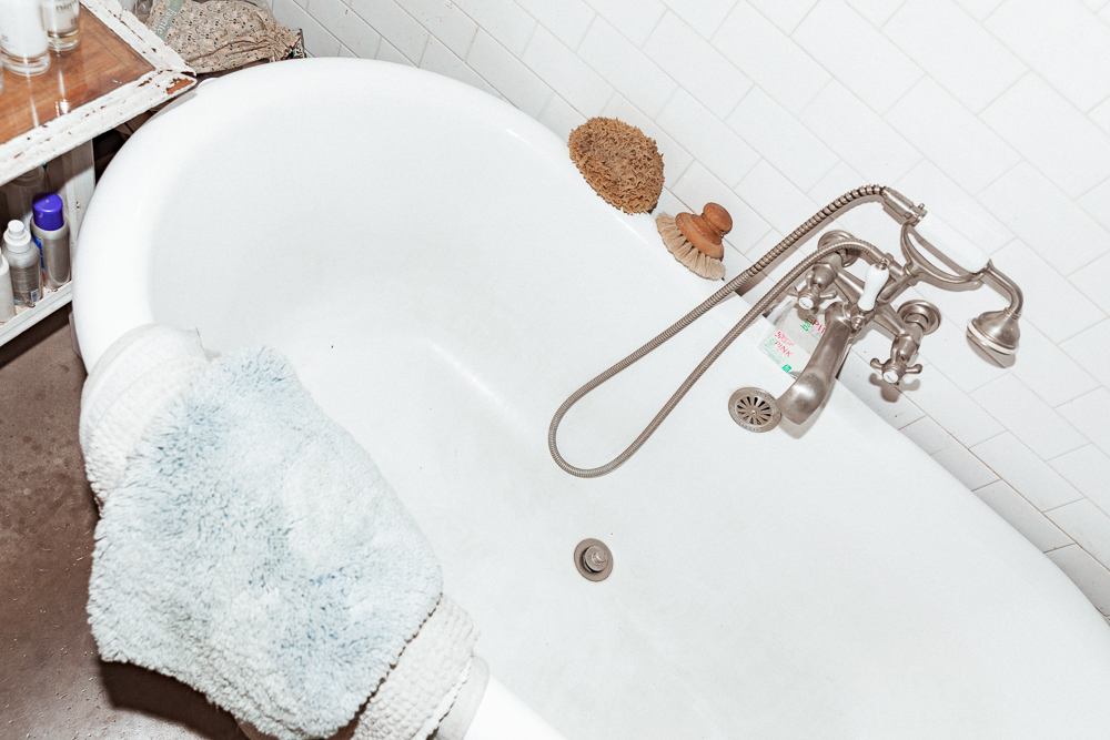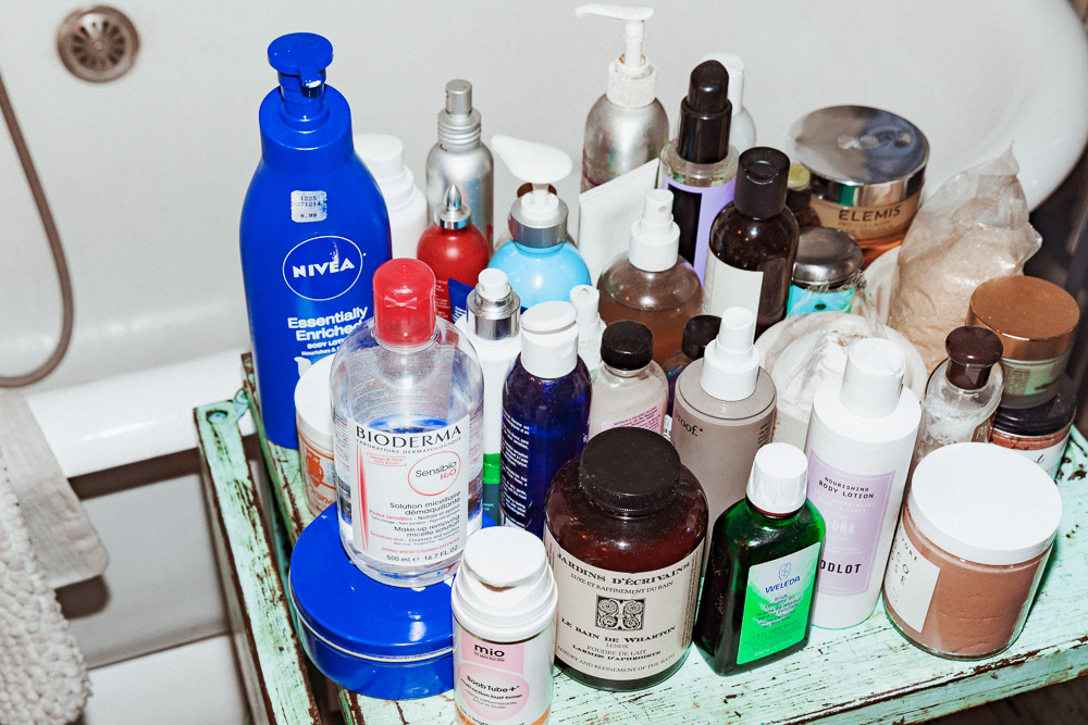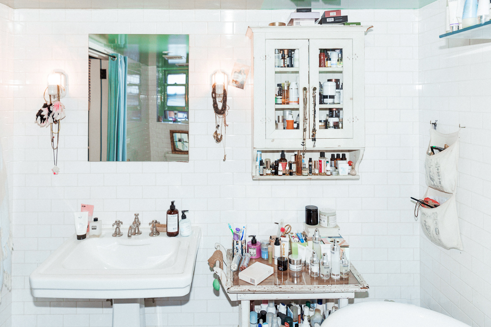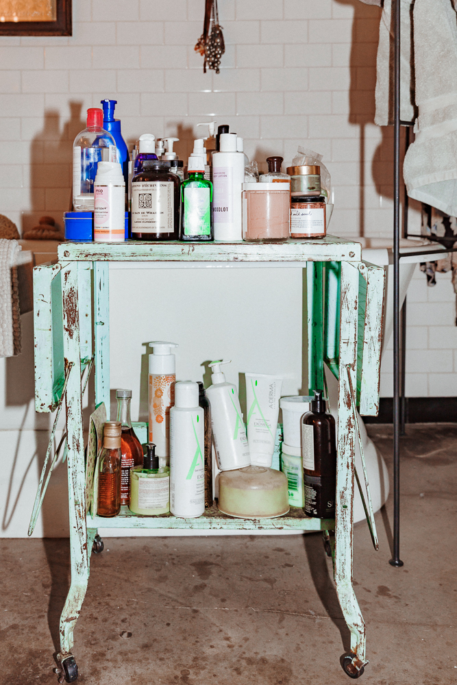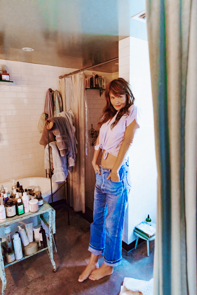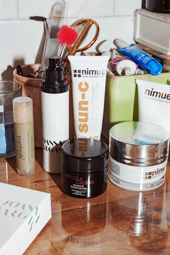 I used to hardly do anything for my skin, but then I started getting more and more excited about my products in my early 30s. I’m working with a South African skin product brand that is fucking amazing. It’s called Nimue—it’s insane. They don’t sell in America right now, but I’m doing a three-month trial with them. I love their Exfoliating Enzyme, so I will use that with the Joanna Vargas Vitamin C Face Wash, which is really good. Then, Angela Caglia’s Dream Exfoliant Mask and Detox Serum are so beautiful. Evanhealy’s French Rose Clay Mask is so good, too. I also use their Nourishing Eye Balm. Then, there is SPF, which I only started using later in life. Back then we would put oil on and would just sit out, it was crazy. Now I’m using Nimue Sun-C because not only does it protect you, but it feels incredible.