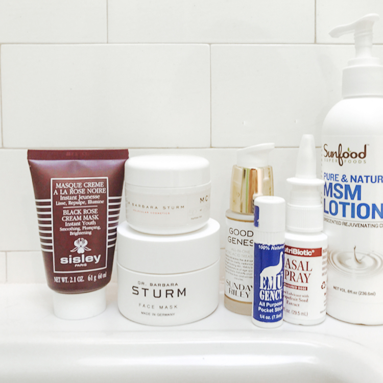 My morning routine also includes a green juice. It’s the quickest way I know of to get the hit of phytonutrients my body deserves. I make mine at home, and it’s super simple: celery and touch of lemon. Purified water with a squeeze of lemon can work, too—the original alkaline fluid. Staying hydrated, I have found, is my best bet for my complexion. I also take Dr Barbara Sturm’s Skin Food and Ora Nothing Fishy Here Plant-Based Omega-3 Spray.