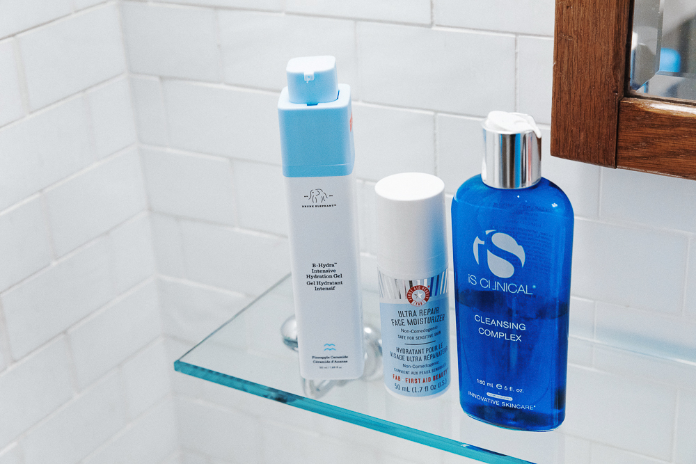 I like to feel clean, but I don’t want [my products] to be super stripping. Morning and night I use this iS Clinicals, which is like a gel face wash, and it does that for me. It’s slick and it foams a little bit, but it doesn’t make my skin feel tight afterwards. At night I’ll use it dry if I’m wearing makeup, and then I’ll wash with it again, sort of like a double cleanse. Then I use the Drunk Elephant B Hydra Gel. Which seems like it still does something...but it also feels like water, so if it soaks in really quick I’ll put a few layers on. Drunk Elephant I like because it’s natural, but it doesn’t have a really heavy smell. I feel like a lot of [brands think] if you put a smell in something you can pass it off as natural because it smells like the woods.