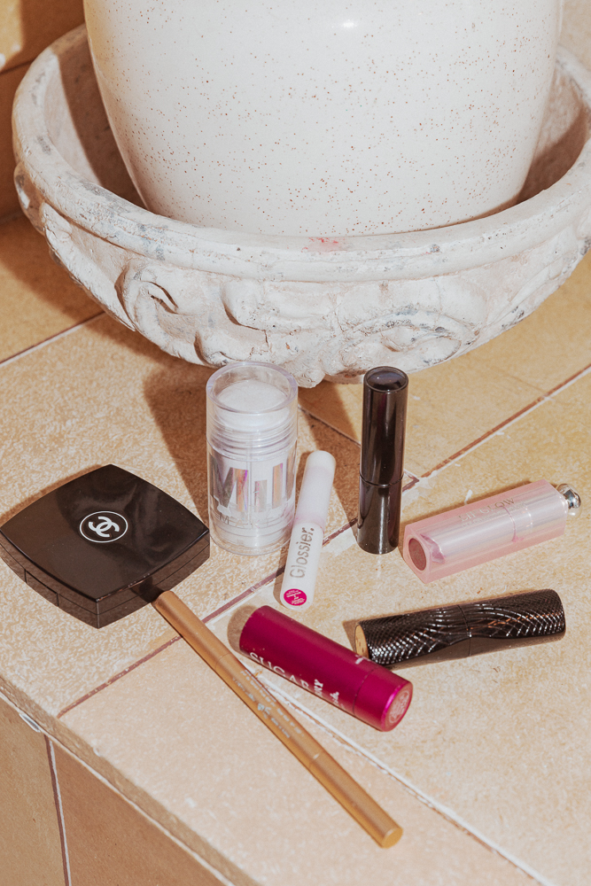 I love a good lip balm, and I use the Clé De Peau concealer. My assistant laughed her ass off when I asked her if she had heard of it. She was like, ‘Everyone uses this.’ To be honest, one of the reasons I have never really played with foundation and stuff because I’m eurasian and because I’ve never found it easy to find my skin tone. This is Ochre, and the technique is clean hands and then just a tiny dab on pimples. I also got the Chanel Les Beiges compact. Then I use the Milk Holographic Stick, which is cool. But if I’m going to do anything really, I’m going to mess around with my lips. My friends take pity on me and they give me tutorials on how to use liner, and Alex Spencer swears by the Glossier Lip Gloss, so she showed me that. And I swear by Glossier Gen G in Jam. I guess I like lipsticks that you don’t have to get perfect.