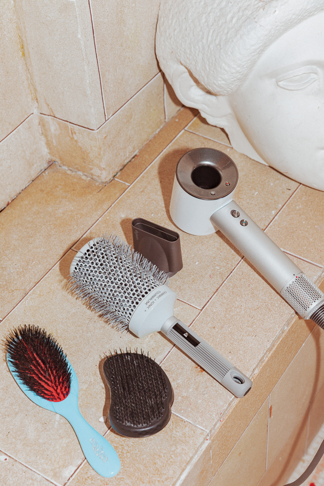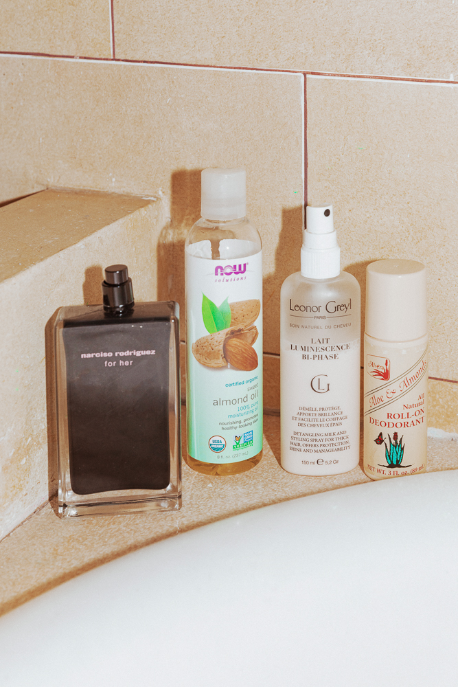 When I have to go somewhere, sleep is the most important thing to me. I struggled with insomnia in my early 20s, so it’s something that haunts me sometimes. But to get out the door, I dry brush and then put almond oil all over myself before I have a shower. I find it really replenishing to my skin, especially because I find that water dries out my skin and I hate feeling dry. After my shower, I’ll cover myself in MSM lotion that I got from an organic grocery store. MSM is a supplement a lot of people take if they suffer from arthritis because it has connective tissue elements in it, but it’s otherwise a really simple moisturizer. Then I’ll use Dr. Strum’s Cleanser and blood cream. I’m addicted to this one thing—Sunday Riley Good Genes. There’s something about it, it’s very active. I will also always put on a sunscreen afterwards.