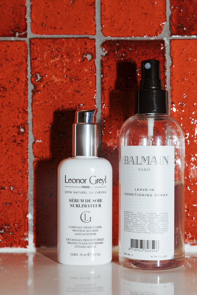 My hair is naturally blonde, but I dyed it a little blonder a year ago. I use silver shampoo to [maintain the color]. I try not use conditioner because it makes my hair heavy, and I like to have a little volume. Instead I use the Leonor Greyl Serum de Soie Sublimateur to make my hair stronger and I use a sea salt spray if I’m going out. When I had longer hair, I used to use clip-ins. Now I use one or two because my hair is very thin. I got mine from a shoot. They don't always let you keep them, but this time I got lucky. [Laughs]