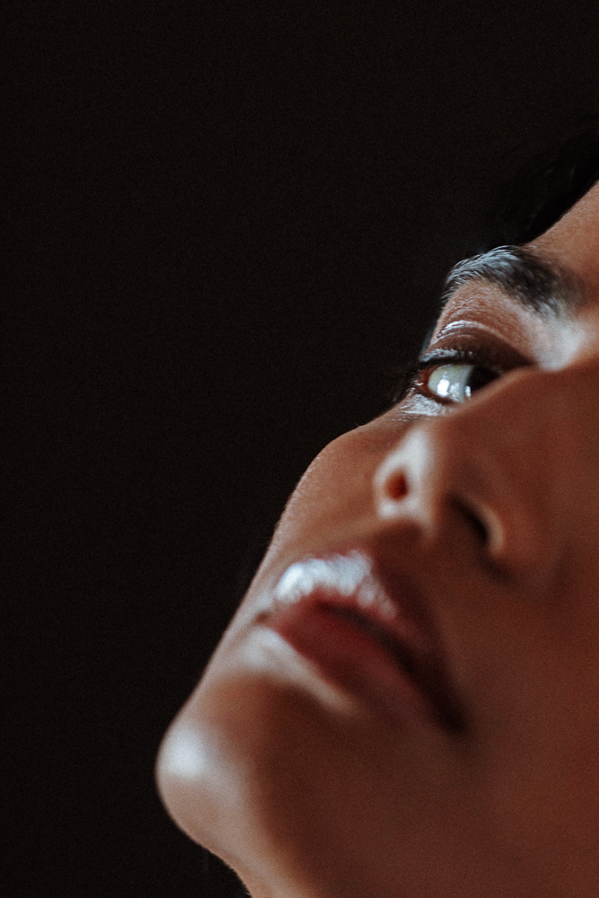 Wendy used Burberry’s Fresh Glow Foundation and the brand’s Sheer Concealer on Bhumika’s skin for a fresh, clean slate. Burberry’s Face Contour Pen added a little depth to the cheeks, and Glossier Haloscope topped the cheekbones. (Wendy can show you how to use Haloscope here, too.) On the eyes, Burberry’s Eye Contour Pen went along the socket line for more depth and some definition. Burberry’s Lip Contour in Dark finished off the mouth. A flush of Glossier Cloud Paint on the cheeks. Feels a little warmer already.