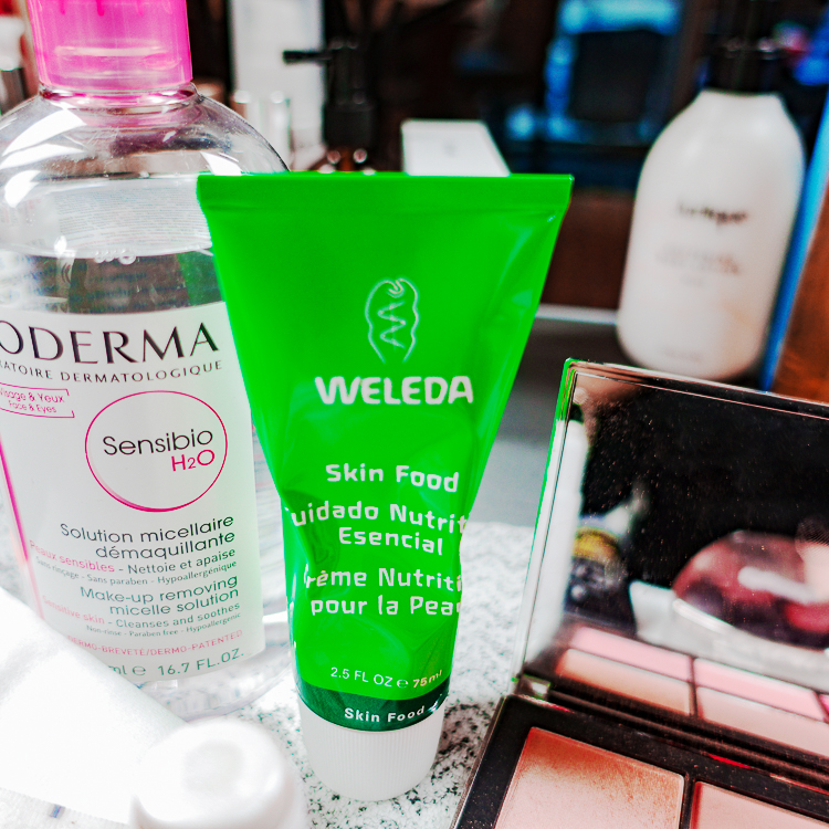 "My main multi-purpose cream is definitely Weleda Skin Food. I use it for any dry bits on the skin, or as a highlighter if I need to just to amp up the shine on the skin on the cheekbones or the legs. I would also use it under a full coverage foundation to create a really dewy base. You could put it on under double wear and it would look light as a feather. I use it to clean up makeup mistakes—if I've gone outside the lips a little bit I'll take a Q-tip, twist it into a bit of the Skin Food, and the use it like a magic eraser."