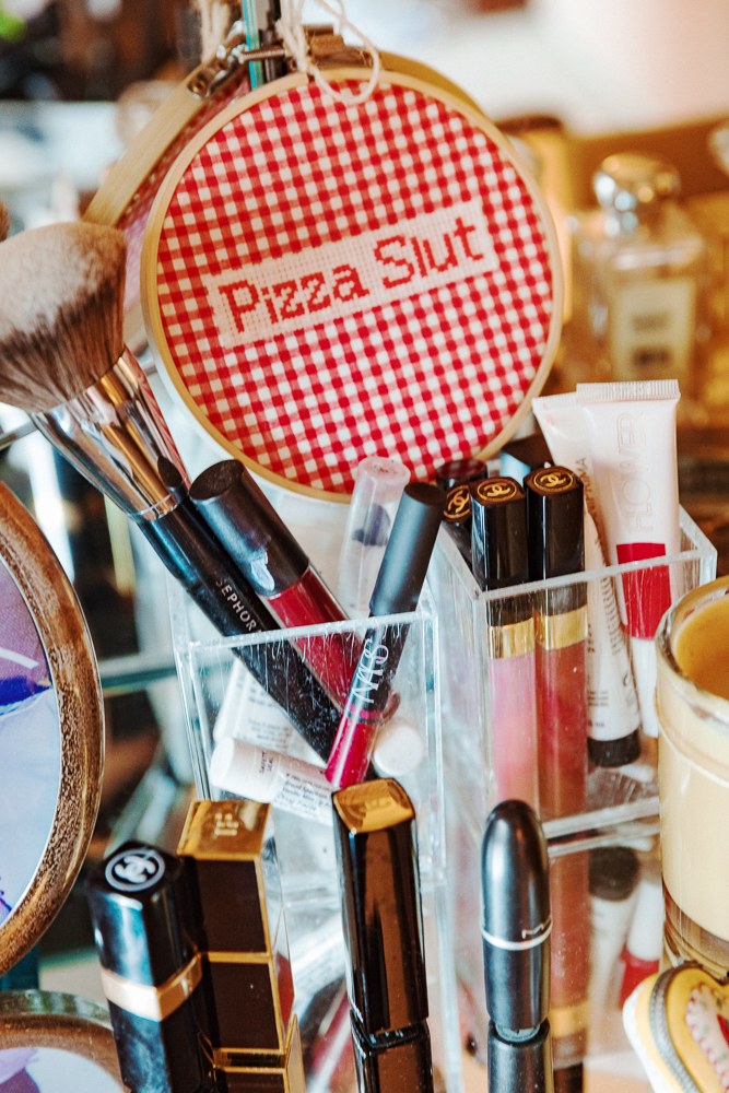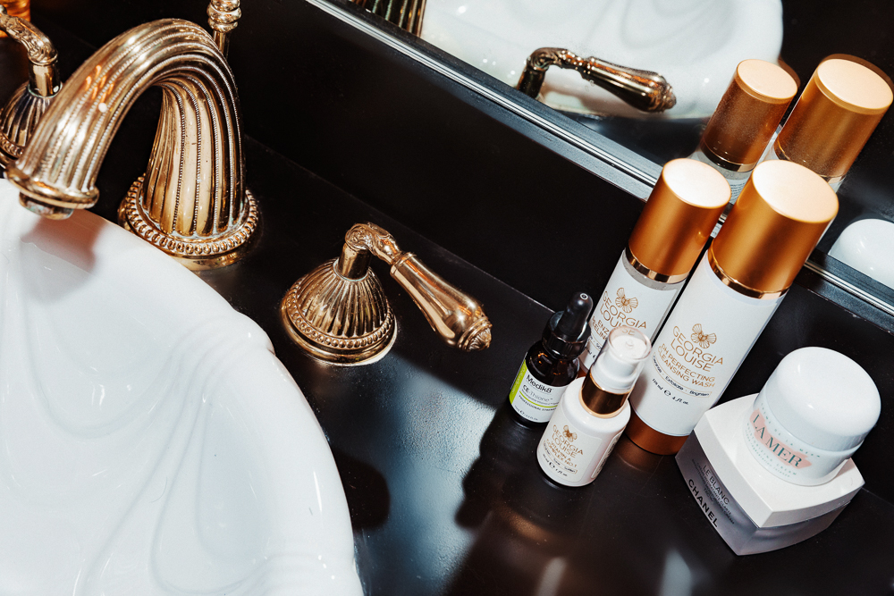 For my 40th birthday, my friend gave me a gift certificate to Georgia Louise. She said, ‘She’s so amazing. She does Christy Turlington and Linda Evangelista, and all these people.’ I was like, ‘I’m not them, but I wouldn’t mind being them.’ I wound up going, and [Georgia] said, ‘If you want to keep coming to me, you have to do this regimen.’ I learned so much in that facial, and I haven’t missed a month since—it’s been four years almost. She helped me get rid of all my age spots–they’re pretty much gone. She brings me all this shit from Korea, like a drug mule, and I can’t even read the labels because I don’t speak Korean. I use the Georgia Louise Cleanser, and twice a week I do her mask peel-y thing. I leave it on for 10-12 minutes while I’m getting the kids ready and then I wash it off in the shower. Then I go straight to serums. I have a whole bunch of serums that I layer and I just do a mix of whatever I’m feeling that day. I like the Medik8 CE Thione. It stings if I’ve done the peel, but I kind of like the sting—not that I’m a sadist, but I feel like it gets in there deeper. It actually says in the directions not to do it after a peel, but I do it, because I like to live on the edge. I also use the Georgia Louise Vitamin A Complex which is good for brightening. Her stuff’s really vitamin-rich. Then I use La Mer Cream that I got as a present, and I’m just nursing it ever so slowly because I don’t know if I can spend six-hundo on face cream. I’m really oily, like, BP could drill on my face, but I do have dry zones and I get really dry in the winter. [The La Mer] works–it evens me out–but I don’t use it on my t-zone. Sometimes, if I have time, I’ll use the Nuface Trinity. I call it the monkey balls. It really lifts your face. I also have this LED mask that stimulates collagen. Now that I’m going through menopause, it’s like Mount Vesuvius on my forehead, and it’s gone after I use [the mask]. It just zaps it.