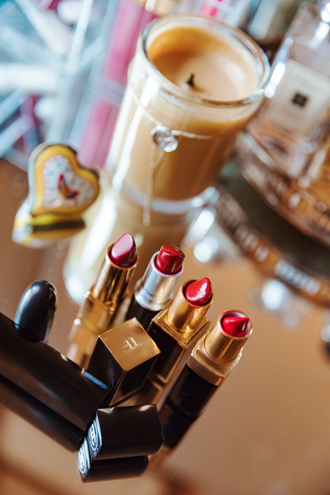 I do the same look every single day—I never, never mix it up. I know myself so well at 43 that I know what my comfort zone is and what makes me feel like me. I wear black and white every day, it’s a like a uniform. I have one red dress I pull out for Valentine’s Day, or the holidays. Even if I wear no makeup, I’ll throw on a red lipstick. I love red lipstick. It’s in all my bags and I have a bunch flying around. I’ve found that part of aging is that your lipstick feathers by the end of the night. This Armani lip thing has totally halted that. It looks like a lip conditioner but you put it not just on your lips but also on the skin around your mouth, and it halts the spread of the lipstick. It’s really changed my life. I have like six Nars pencils in each handbag. My favorite is Palais Royal. I only use the Armani thing if I’m getting ready, and I have to make it last through an evening event. If I really want to go for it, I have the MAC Cremesheen and I like Dare You which is a cream, blue-toned red. I also wear Ultraberry [Ed note: discontinued] from Chanel. My sister-in-law, Drew Barrymore, started Flower Beauty, which is in Ulta now, and they have really good colors. I use Red My Lips. I use Armani foundation and I use the Hourglass Luminous Light if I’m going to be on a morning show because it’s heavier coverage. For powder, I use MAC Prep and Prime, and then this Make Up For Ever one.