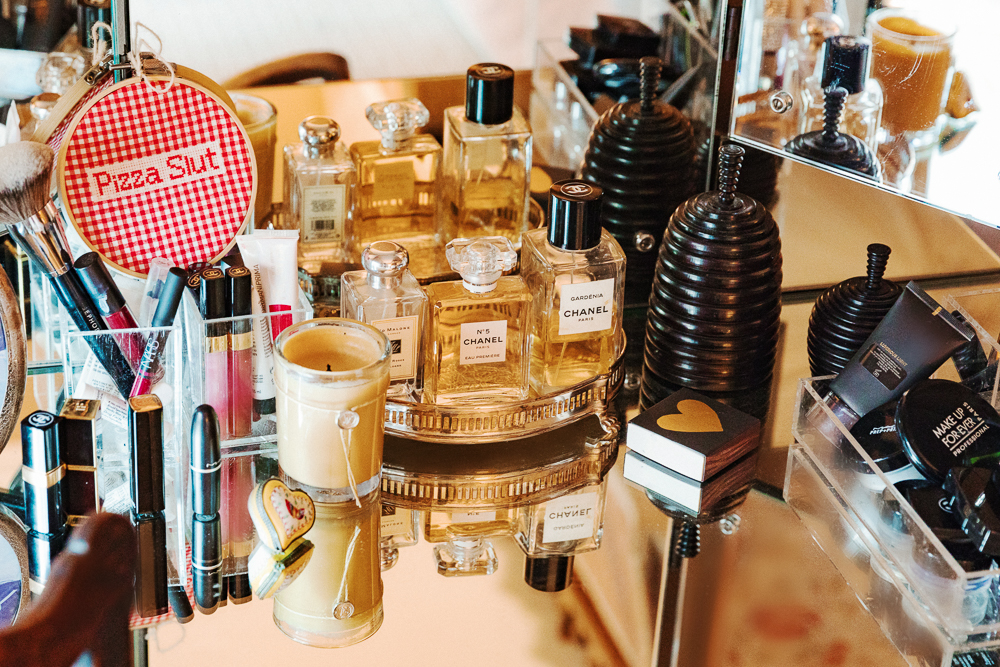 I wear Jo Malone Red Roses most days, and Chanel No. 5. My mom wears this, so it smells like my mom, and it was the first perfume I ever had. The Jo Malone I smelled on someone on the subway, and I was like, ‘What the fuck is that intoxicating scent?’ And she told me Jo Malone Red Roses. I went and bought it like a single white female stalker, and now people stop me on the subway at least once a week asking me what my intoxicating fragrance is! As the Glossier pop-up said, ‘The missing ingredient is You.’ I think my body chemistry doesn’t work with a lot of the famous fragrances, because when I’m at a friend’s house and I’m like, ‘Oh, I have B.O., I’m gonna use some of your perfume,’ it never smells good on me.