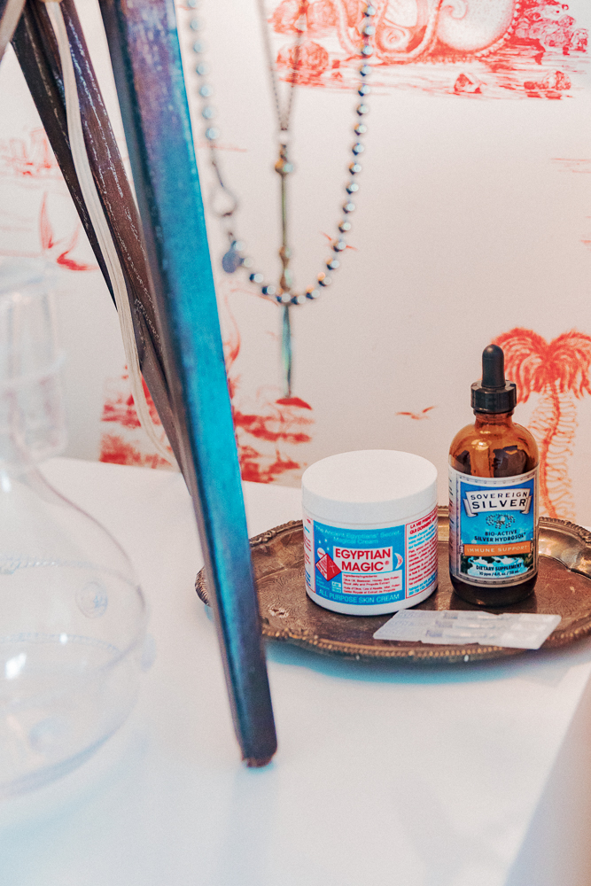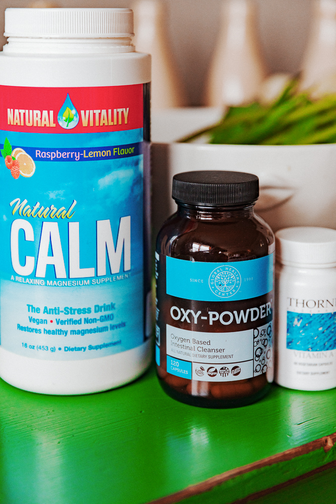 There’s two other tips that I just have to go on record with. The first is Oxy Powder, this oxygen-based intestinal cleanser. So many women don’t go to the bathroom regularly, and that will break you out. This saves my life—it works unlike anything you’ve ever used before because it’s just oxidized magnesium. I would start with two, even though the bottle says four. It doesn’t cramp you at all. That’s for certain situations though—otherwise, I do the Natural Calm Magnesium Supplement in my water. And the last best tip ever is that I put hydrogen peroxide in some water—just six drops of it in one of those small bathroom cups—and I gargle with that and spit it out. I’ve been told to do this by a lead endodontist in the country and two cosmetic dentists. When you start to have a toothache and you can feel that bacteria in your gums and you gargle with that, it just completely kills it. People come back to me all the time saying that was the best tip I’ve ever given.”