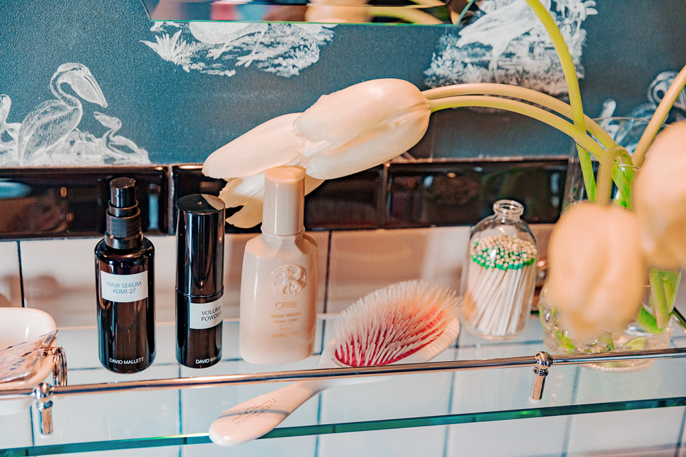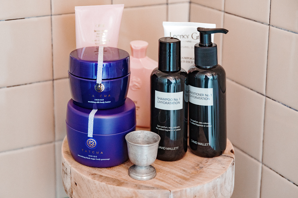 David Mallett is my favorite thing right now. He’s so charming. I met him in Paris and he suggested this Hydration Shampoo and Conditioner for me—I have drier, super coarse, frizzy hair. He also said to use the Hair Serum #DM027. I said I want to have a lot of volume, and he said to use the Volumizing Powder. It’s the most amazing, workable tool I’ve ever seen for hail. These new Oribe Serene Scalp products have salicylic acid in them. I only wash my hair once a week, maybe twice, so when I really need my scalp cleaned, I use those two. And I think the Leonor Greyl Shampoo Rivivisance is so good. My favorite body products right now are the Tatcha Indigo Scrub and the Body Butter. That keeps my body skin looking the best—I notice the difference on my elbows and the creases in my arms and hands. It emulsifies so well.