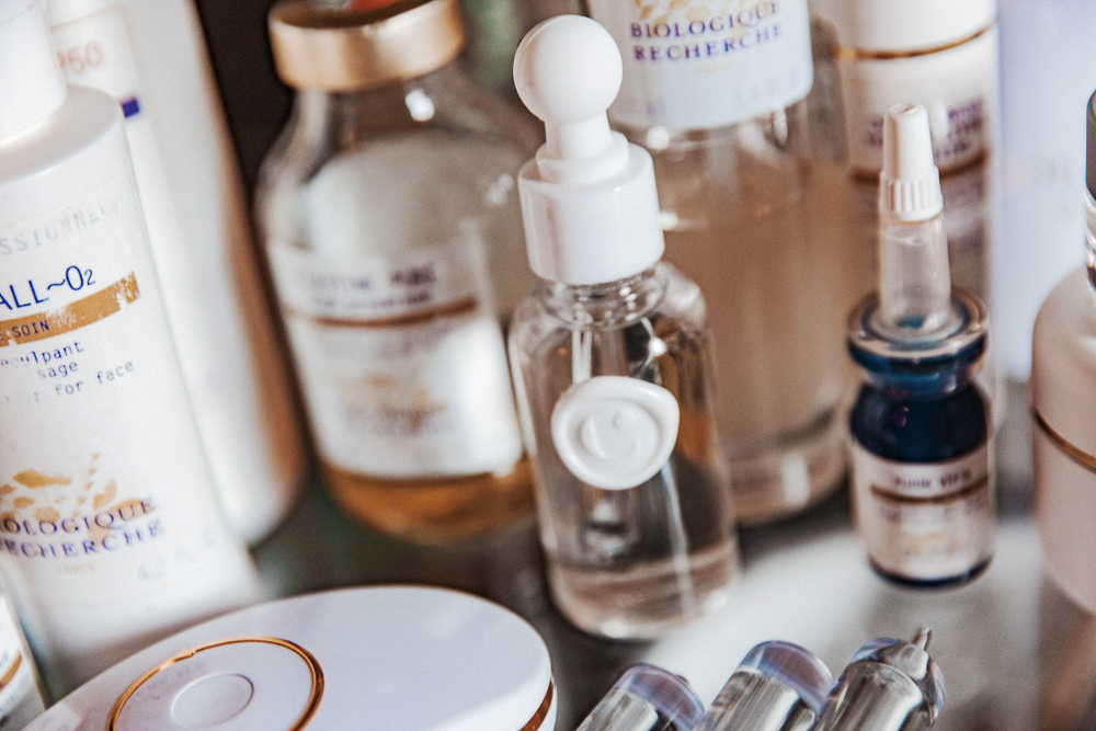 After that, tone. With toning, you have to think about what your face needs. Is it in need of an exfoliation? When you touch it, do you feel skin on there that needs to come off? The thing is, to optimally prep your skin in terms of aging, you do want to slightly acidify the surface. In aging studies, 5.5 is the optimal pH—neutral is 7. My toner, Biologique Recherche P50 1970, is somewhere in the 3 range, so it’s pretty acidic. Sometimes I leave my skin a little wet or I wet my gauze first to throttle the acidity and bring it towards neutral. Depends on how badly I need it.
