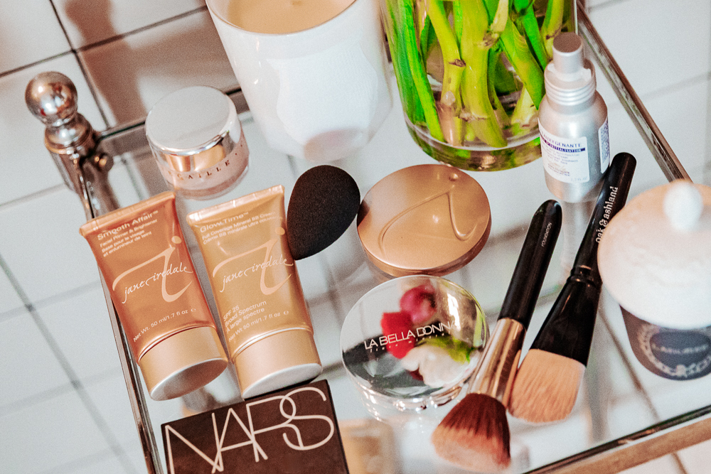 I love Jane Iredale. The sunscreen does not break me out, and it has kept my face as white as the driven snow—honestly. I really like the BB Cream, but I mix it with their Smooth Affair Primer, with more of the primer than the BB cream. The Oxygenating Mist from Biologique on a Beautyblender is also really good to blend that all together on my skin. I always put a setting spray over my makeup, which would be this or that Evian water, or the Avène water. Jane Iredale also makes a D2O Setting Spray that works so well to set mineral pressed powder. For bronzer, I like Nars Laguna because it’s got no sparkly stuff in it. I always do a bronzer and then a pink, pink blush. I’ll usually use the Awake shade from the Jane Iredale line, or I’ll use the pink RMS Lip to Cheek. My favorite thing to top off, once I’ve gotten my makeup on, is the RMS Living Luminizer.