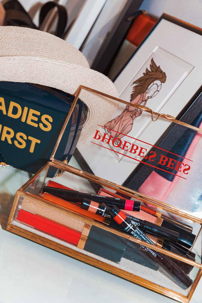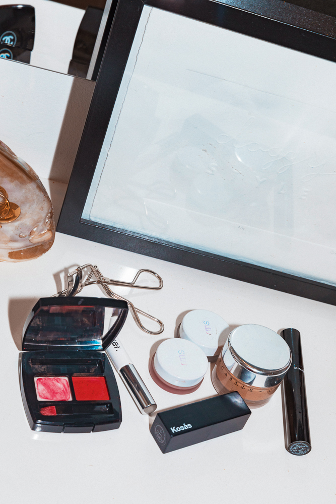You know, I've had a couple of months off of work, and it's been nice not to have heavy makeup on every day. I wore mascara the other night for no reason, and I was like, 'I have not worn mascara in a really long time.' I just always want my face to be clean and glowy. When I'm going out, it's all just a nicer version of what I come to the table with. I actually don't ever wear eyeliner or eyeshadow-usually it's just a bigger lip or brows. I always mix a bit of the Chanel Foundation with my moisturizer. Then I use Glossier Boy Brow in Brown. I curl my lashes, use RMS Living Luminizer on my eyelids and my cheekbones, and then some sort of very red smudgy matte lipstick. I prefer the Chanel lip balm and powder duo—I press it on with my fingers, and sometimes use the residual on my cheeks as blush.