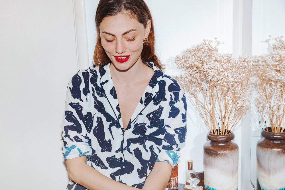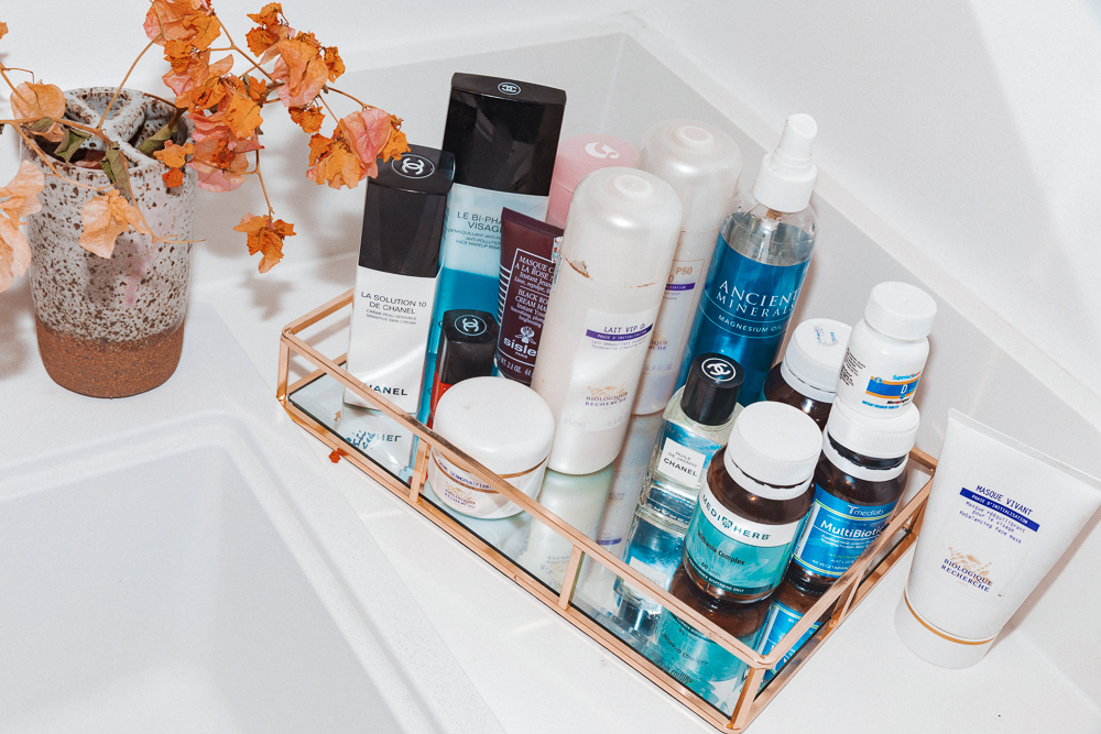 My skincare routine has changed since I shot my Top Shelf, for sure! One of the biggest changes was that I started using all Biologique Recherche. I have this amazing facialist in Australia called Melanie Grant, and she put me onto the P50. And then with my other girlfriend Hayley, at her house we would always inevitably end up drinking wine, and after three glasses of wine she was like, 'Come into the bathroom, we're doing a facial!' And she'd always give me these Biologique facials with all these serums, and the moisturizer, all of it. I'd wake up in the morning with a slight hangover but my skin would be amazing! Eventually I took the plunge and got the whole regimen. My favorite trick is to use the Masque Vivant combined with the Masque VIP. I mix it in my hand with baking soda. A facialist told me about that, and it works. The moisturizer I use is Solution 10, which is the Chanel one, and it's amazing. Then I use the Biologique toner, cleanser, and serum.