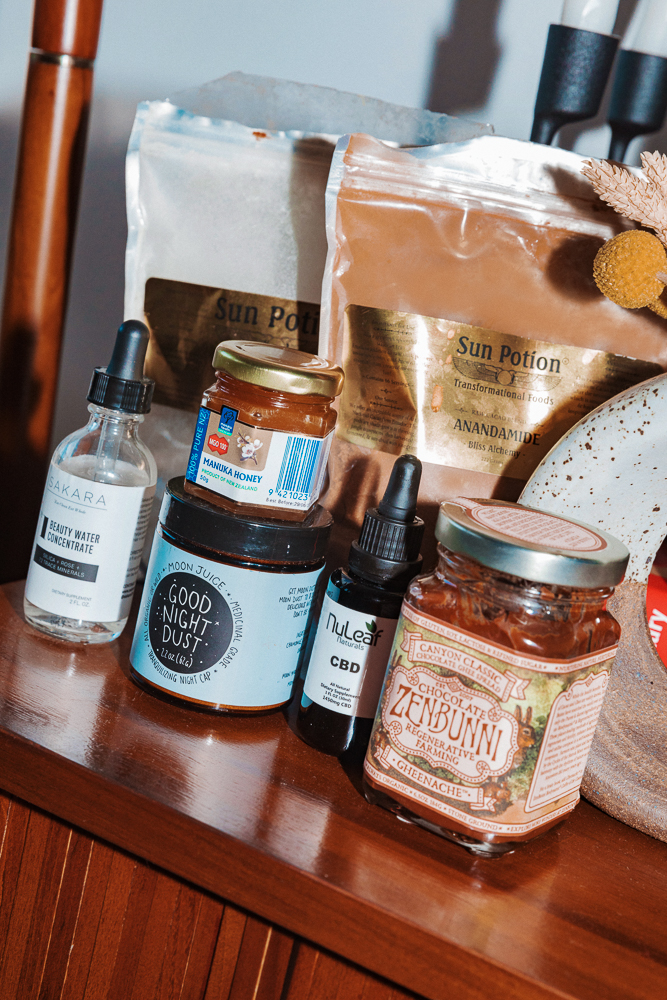 I make a really LA-style coffee. There's this brand called ZenBunni, and they make basically chocolate ghee. The ghee is made of cacao, cacao butter, and something like sugar, and clarified butter. So I mix that with reishi, which is a mushroom, and then I use something else called Tocos, which is a powder. And then I use a spoonful of instant coffee, and I put hot water in that and put it in the blender and blend it up. It's a little bit like a chocolate latte. I started making it because I had an acupuncturist tell me once—I was like, 'I love coffee and I don't want to give it up,' and she was like, 'Your nervous system needs fat to balance it out.' So she suggested putting the ghee in my coffee, and I went one step further by making it chocolate. I'm trying to eat more at home in general. This is really weird, but I'm a big basmati rice person. I just put it on the stove, heat it up. Sometimes I'll put garlic in. I just like rice, and you make it into anything. You can put rice, spinach, and pesto and mix it all up. Late-night, I also like Halo Top. The cookies and cream one. And Beyond Burger. Insanely delicious.