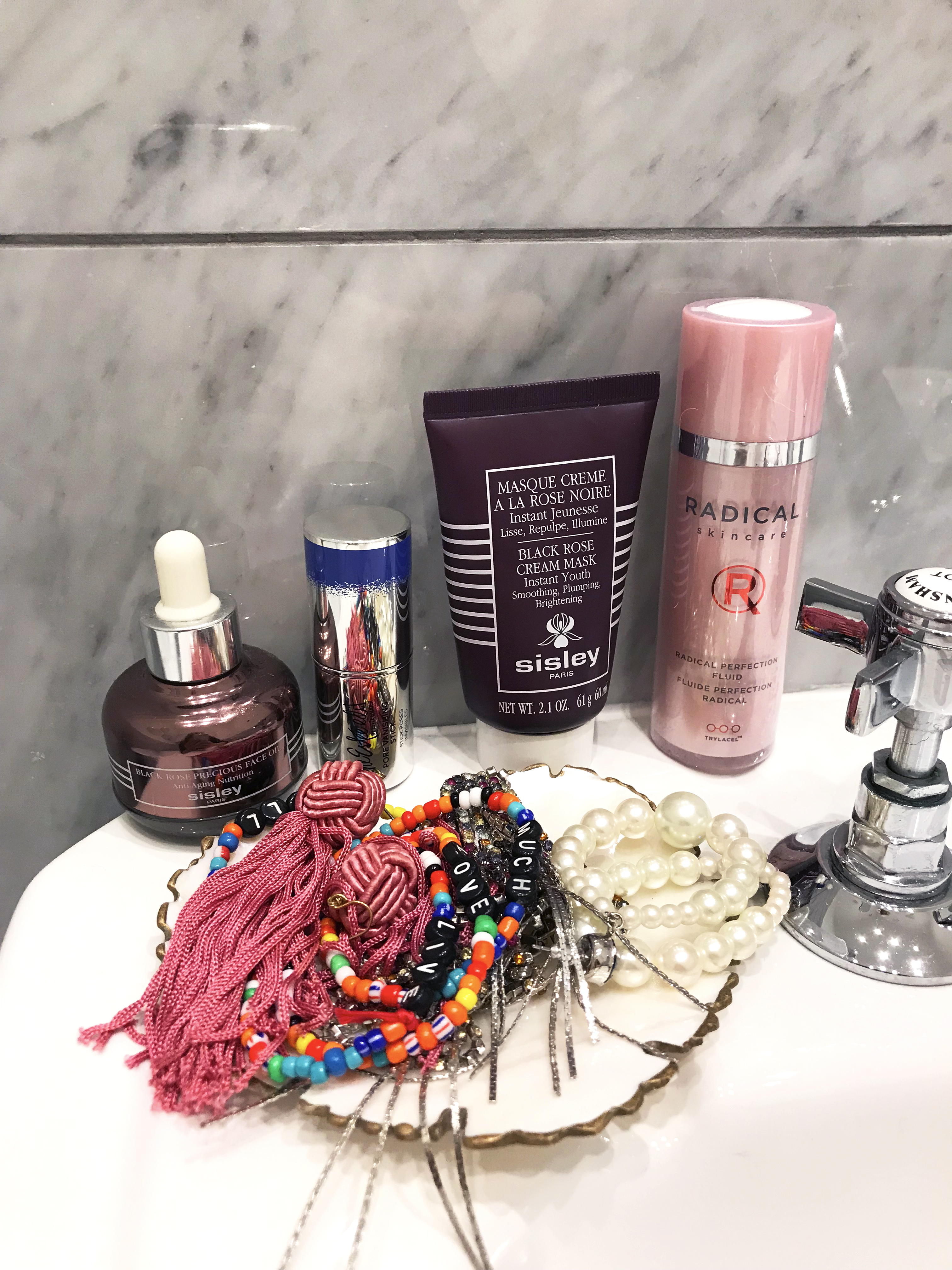 OK, so Glossier Milky Jelly Cleanser is my BFF. It removes my make up in a second. Smells like rose and leaves my face properly clean and refreshed. Two pumps are enough for my whole face—I massage for 30 seconds and rinse off. Then, I love Sisley Hydra Global Moisturizer—it's one of my must have products. I swear you feel it feeding your skin. It smells clean, not fragrant. I use it every day. It's a lightweight cream/gel texture and—something very important to me—it's matte. It's hydrating but doesn't leave you feeling greasy afterwards. Twice a week I like to use Sisley Black Rose Oil, which is a light, cool and non-greasy oil. I'll just apply three or four drops in the morning on my face and neck. It leaves your face feeling toned and smooth.
