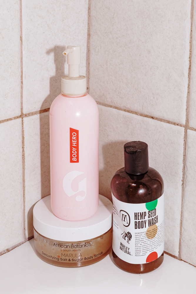 I've completely replaced moisturizers with oils, and I have them for my body, too. Now that I'm getting a little older, I feel like I have to start taking care of my bones a bit. I'll just cover my body in weird CBD creams and oils at night. That's my one ritual that I do. Marley Natural makes this Hemp Seed Body Wash I use a lot, and I've been exfoliating a lot with scrubs. And I'll always use Dr. Bronner's-right now I have an extra large bottle of the almond scent.